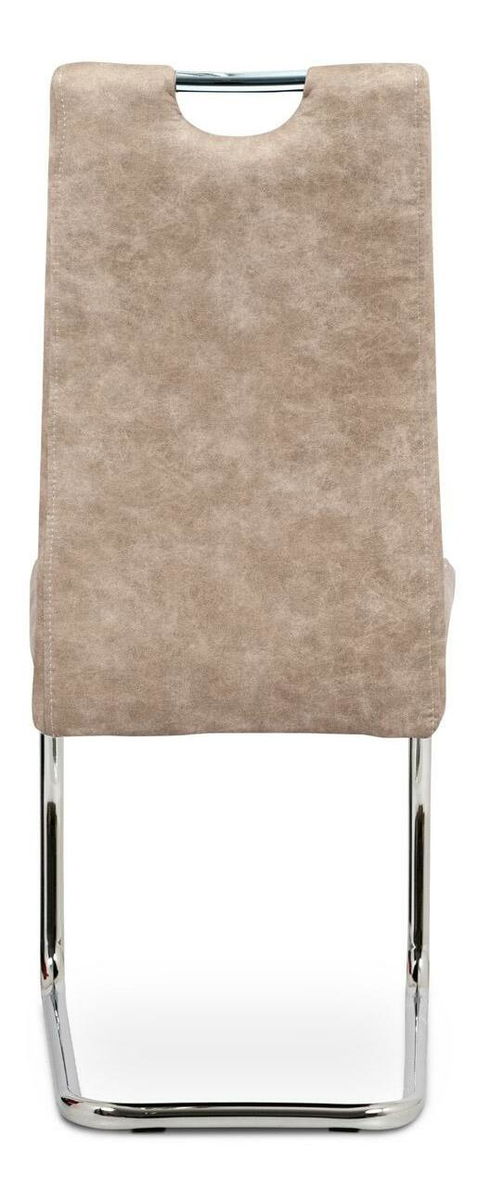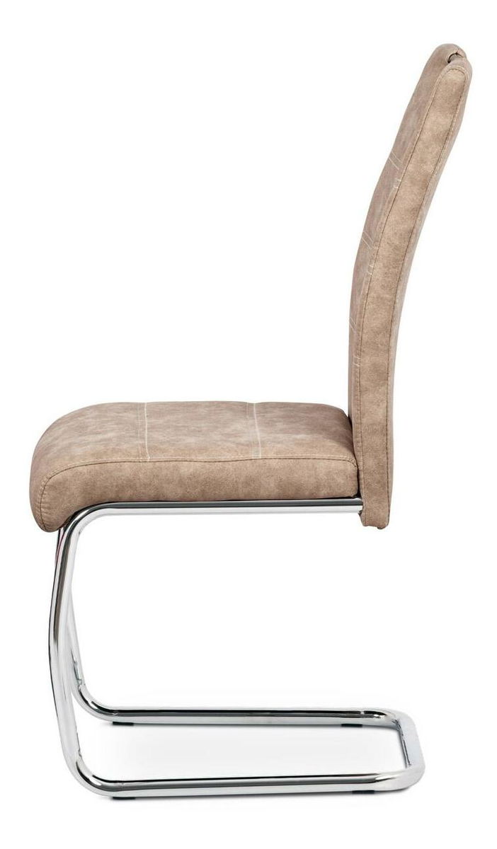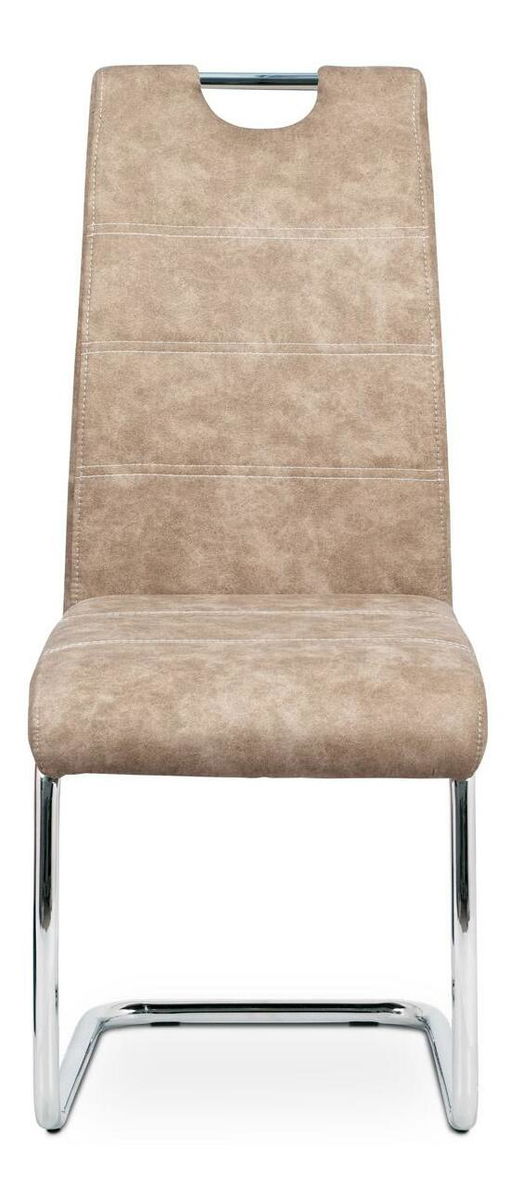 ZobrazitJídelní židle v moderním stylu. Potah krémová látka COWBOY v dekoru vintage kůže, s bílým horizontálním prošitím sedáku a opěradla. Kovová pohupová chromovaná podnož. Nohy jsou kruhového průřezu a ukončeny plastovými kluzáky. Nosnost židle je 110 kg.