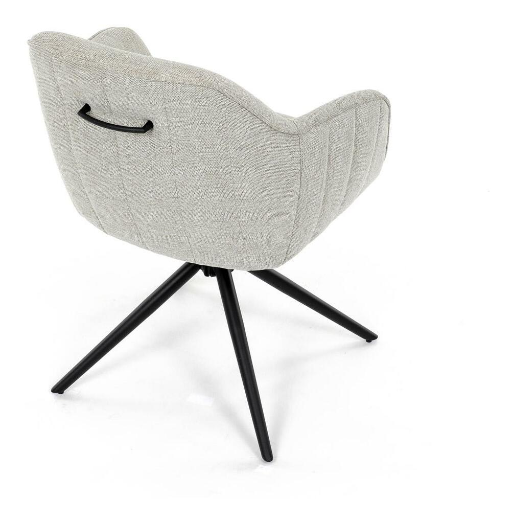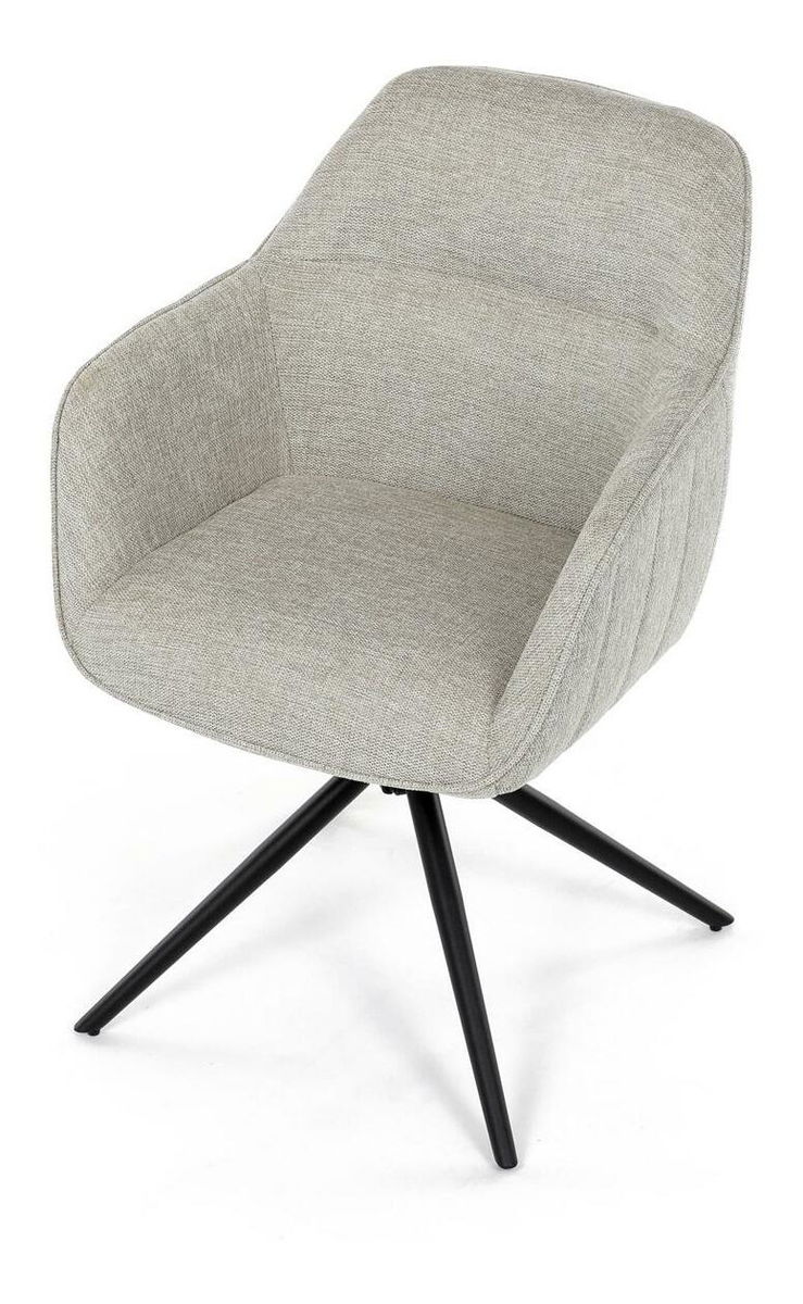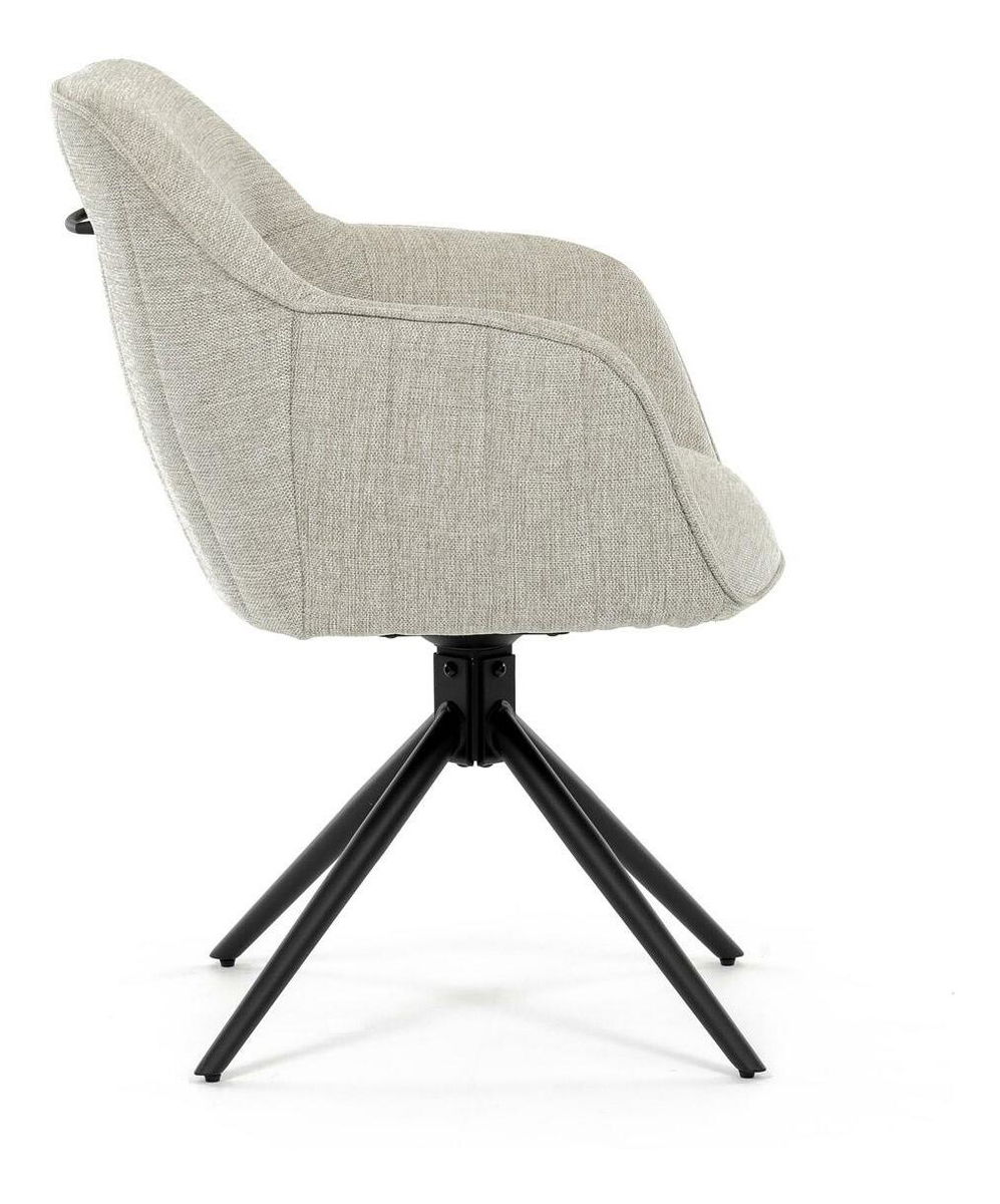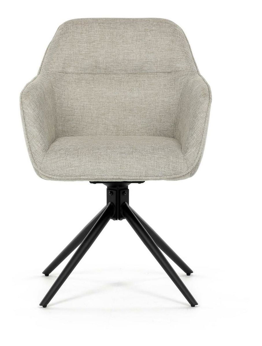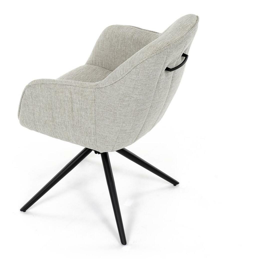 Moderní jídelní židle v krémové barvě s efektním prošitím zádové i přední části opěrky. Prošití je v barvě potahového materiálu. Zadní část opěrky je doplněna vkusným držadlem pro snazší manipulaci. Čtyři kovové nohy v matném práškovém nástřiku vycházejí z centrálního bodu uprostřed sedadla. Sedák je otočný o P90° L 90° s vratným mechanismem - funkce reset.
