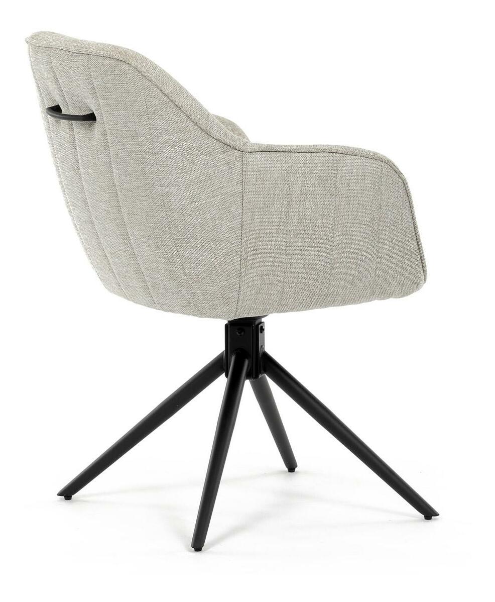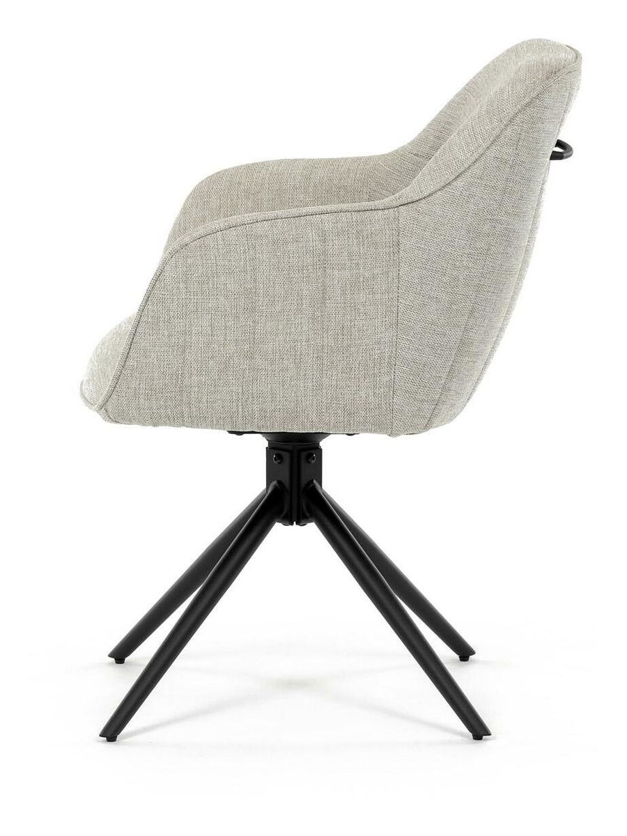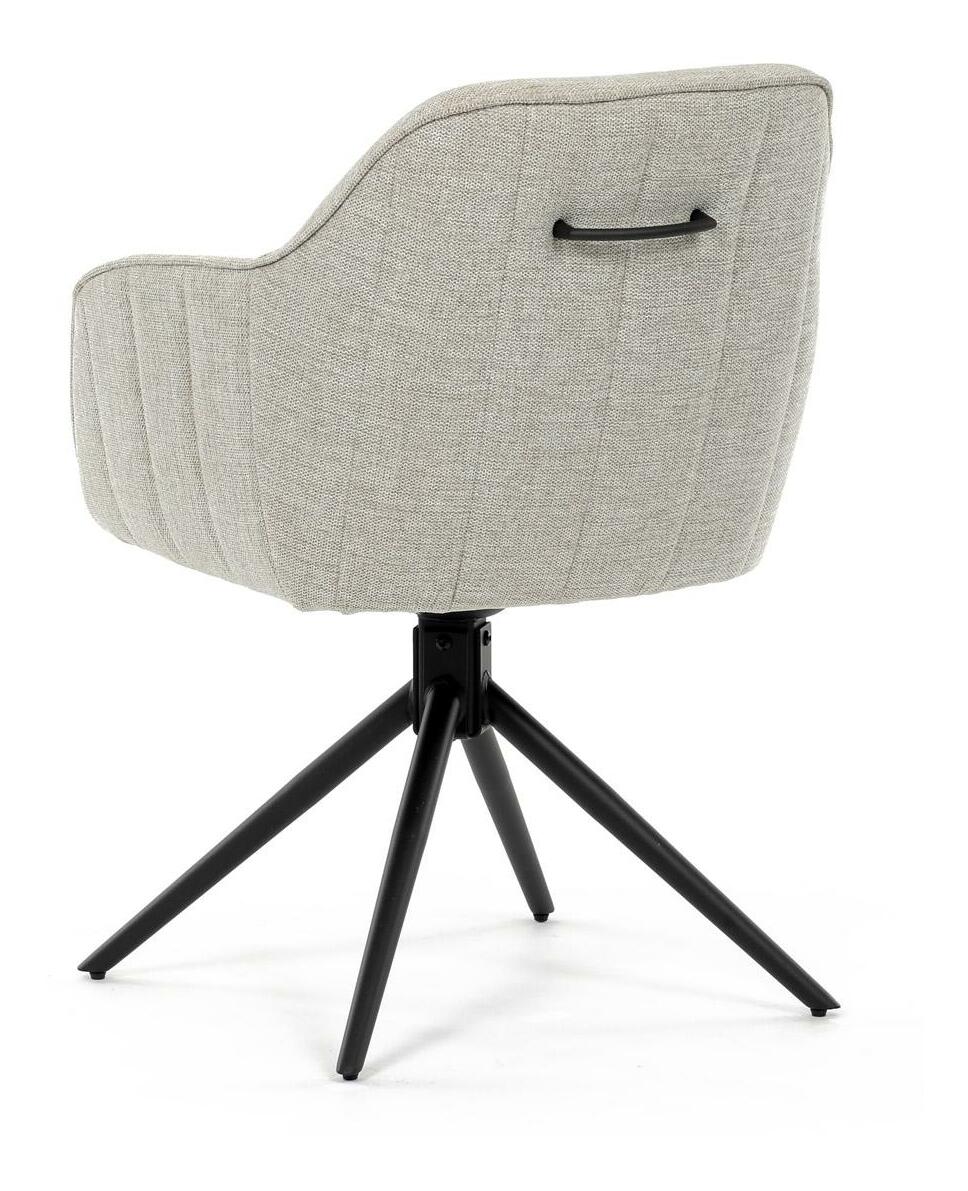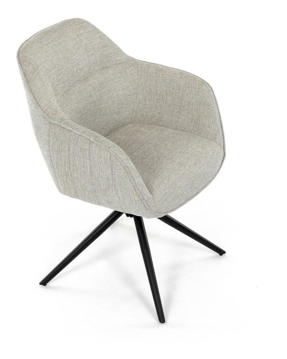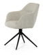 Moderní jídelní židle v krémové barvě s efektním prošitím zádové i přední části opěrky. Prošití je v barvě potahového materiálu. Zadní část opěrky je doplněna vkusným držadlem pro snazší manipulaci. Čtyři kovové nohy v matném práškovém nástřiku vycházejí z centrálního bodu uprostřed sedadla. Sedák je otočný o P90° L 90° s vratným mechanismem - funkce reset.