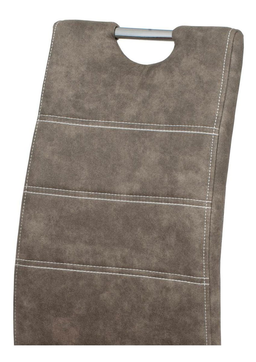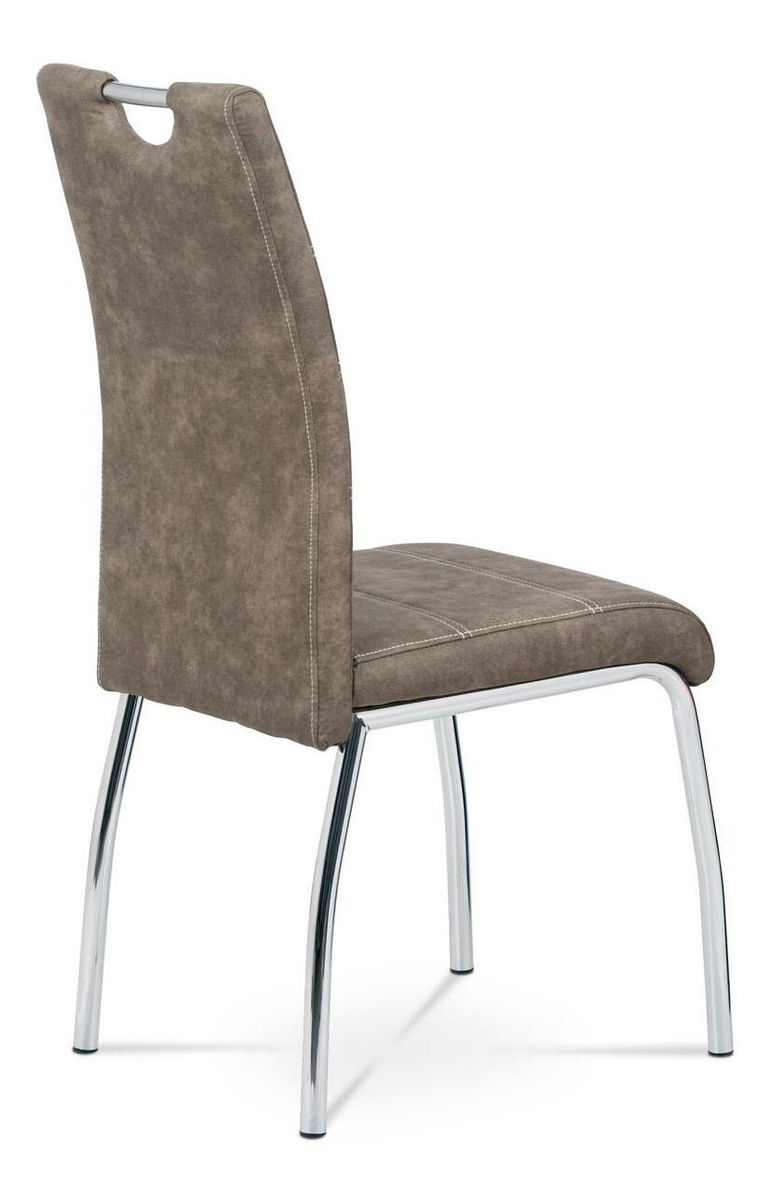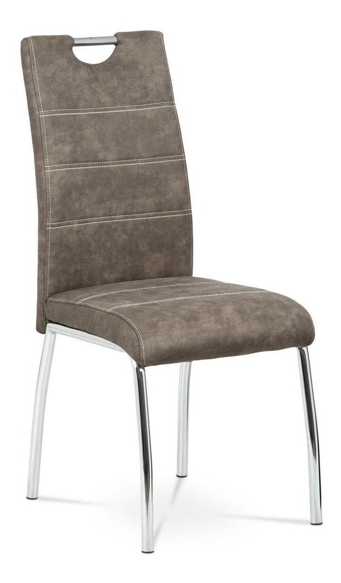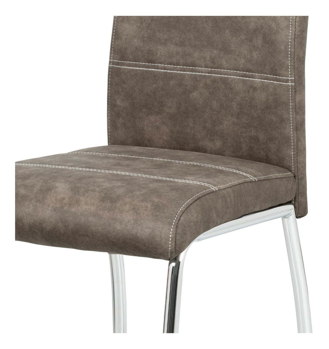 Moderní jídelní židle je čalouněna hnědou látkou COWBOY v dekoru vintage kůže as dekorativním bílým prošitím sedáku i opěradla. Líčivý design podtrhuje kovová podnož s chromovou úpravou. Podnož je navíc speciálně tvarována pro lepší stabilitu a bezpečí. Každá ze čtyř nohou je na černém plastovém kluzáku, což sníží riziko poškození Vaší podlahy. Pro snazší manipulaci má židle i madlo v horní části opěradla, které je kovové a také s chromovou úpravou. Nosnost židle je až 110 kg.