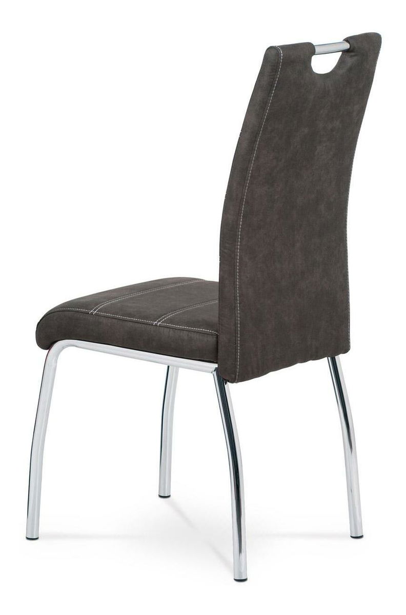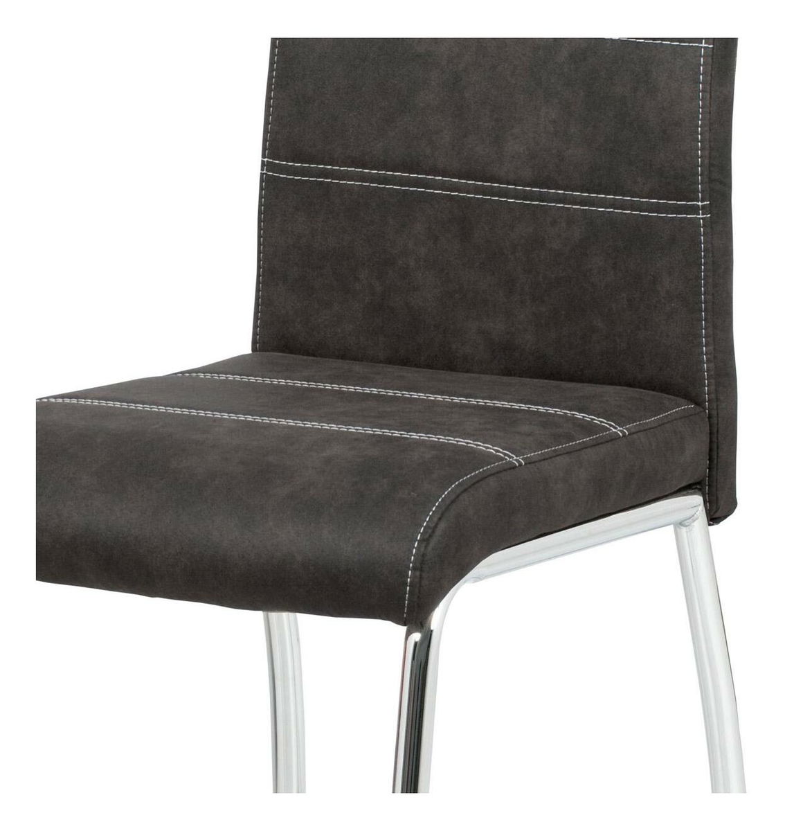 Moderní jídelní židle je čalouněna šedou látkou COWBOY v dekoru vintage kůže as dekorativním bílým prošitím sedáku i opěradla. Líčivý design podtrhuje kovová podnož s chromovou úpravou. Podnož je navíc speciálně tvarována pro lepší stabilitu a bezpečí. Každá ze čtyř nohou je na černém plastovém kluzáku, což sníží riziko poškození Vaší podlahy. Pro snazší manipulaci má židle i madlo v horní části opěradla, které je kovové a také s chromovou úpravou. Nosnost židle je až 110 kg.
