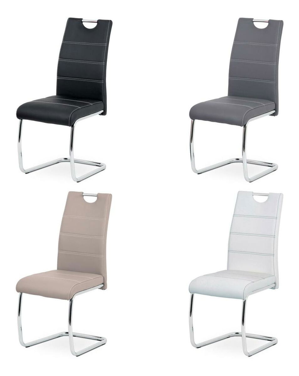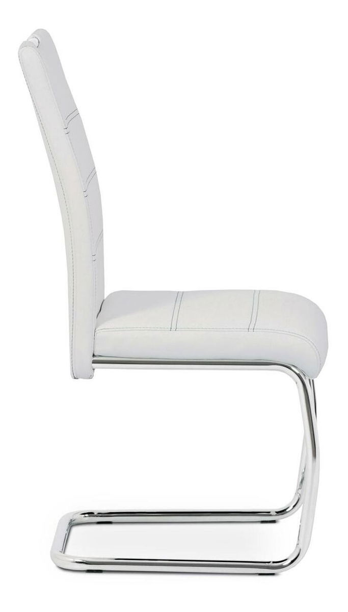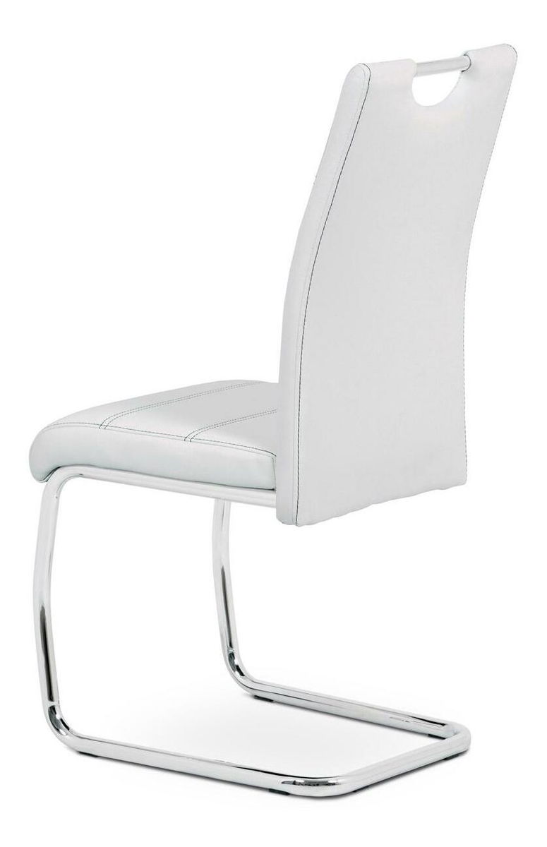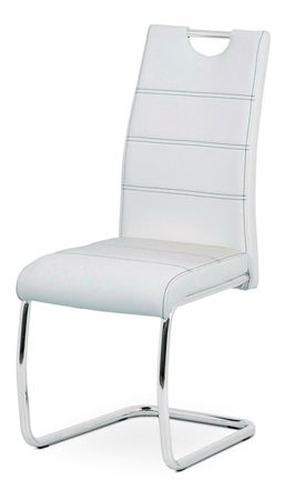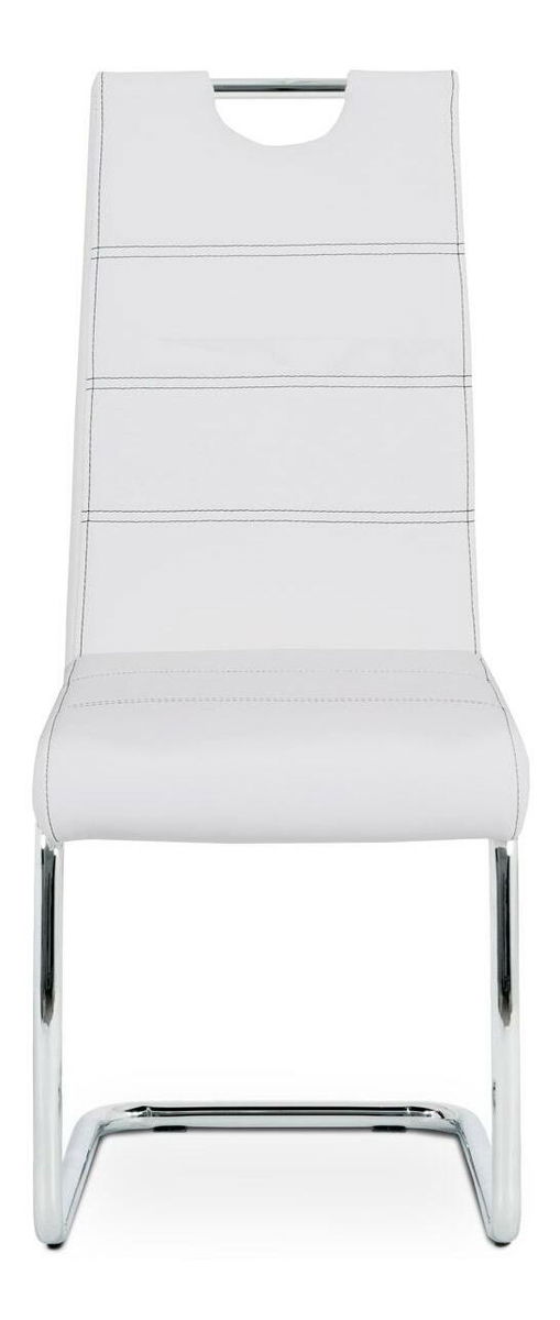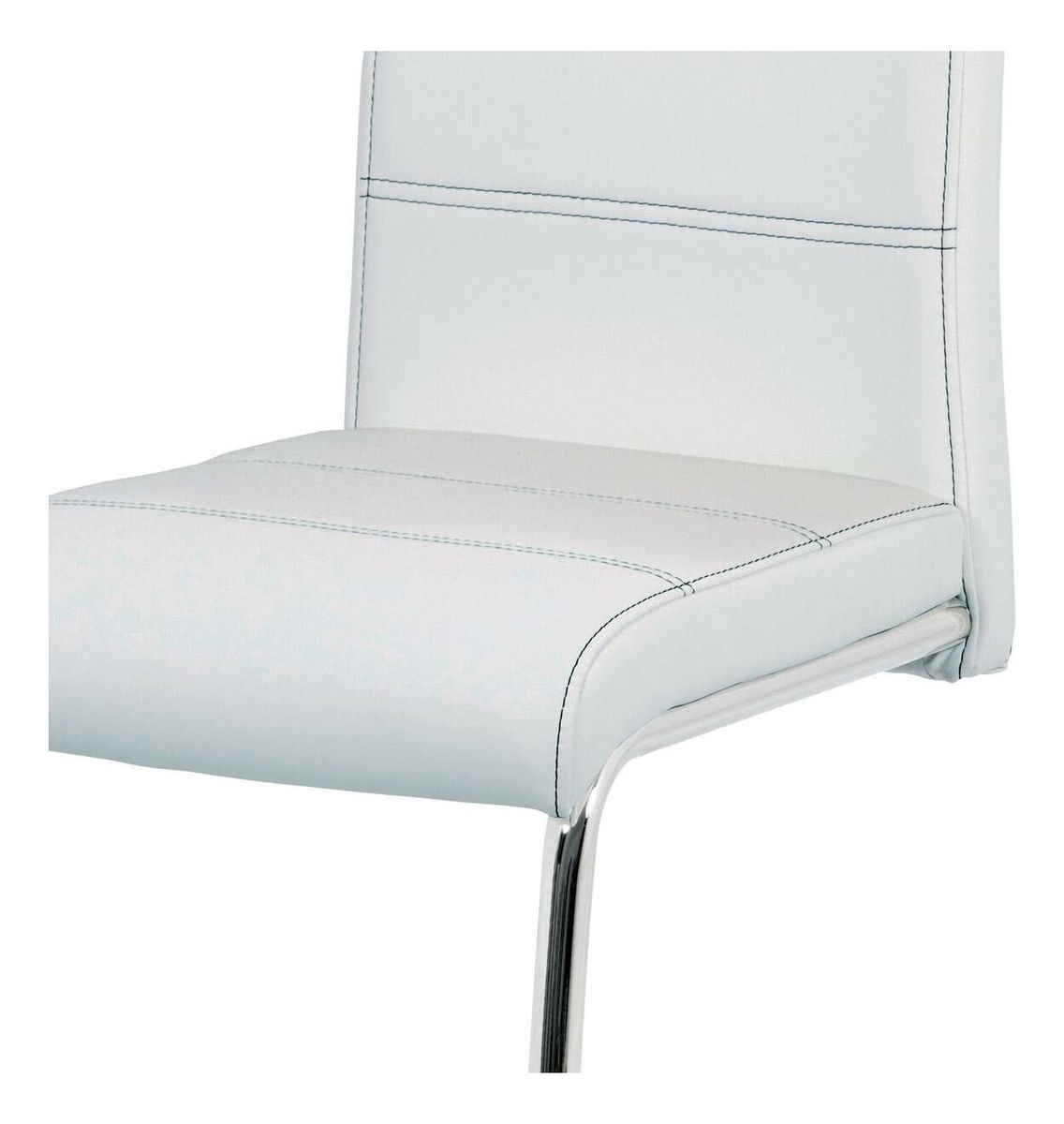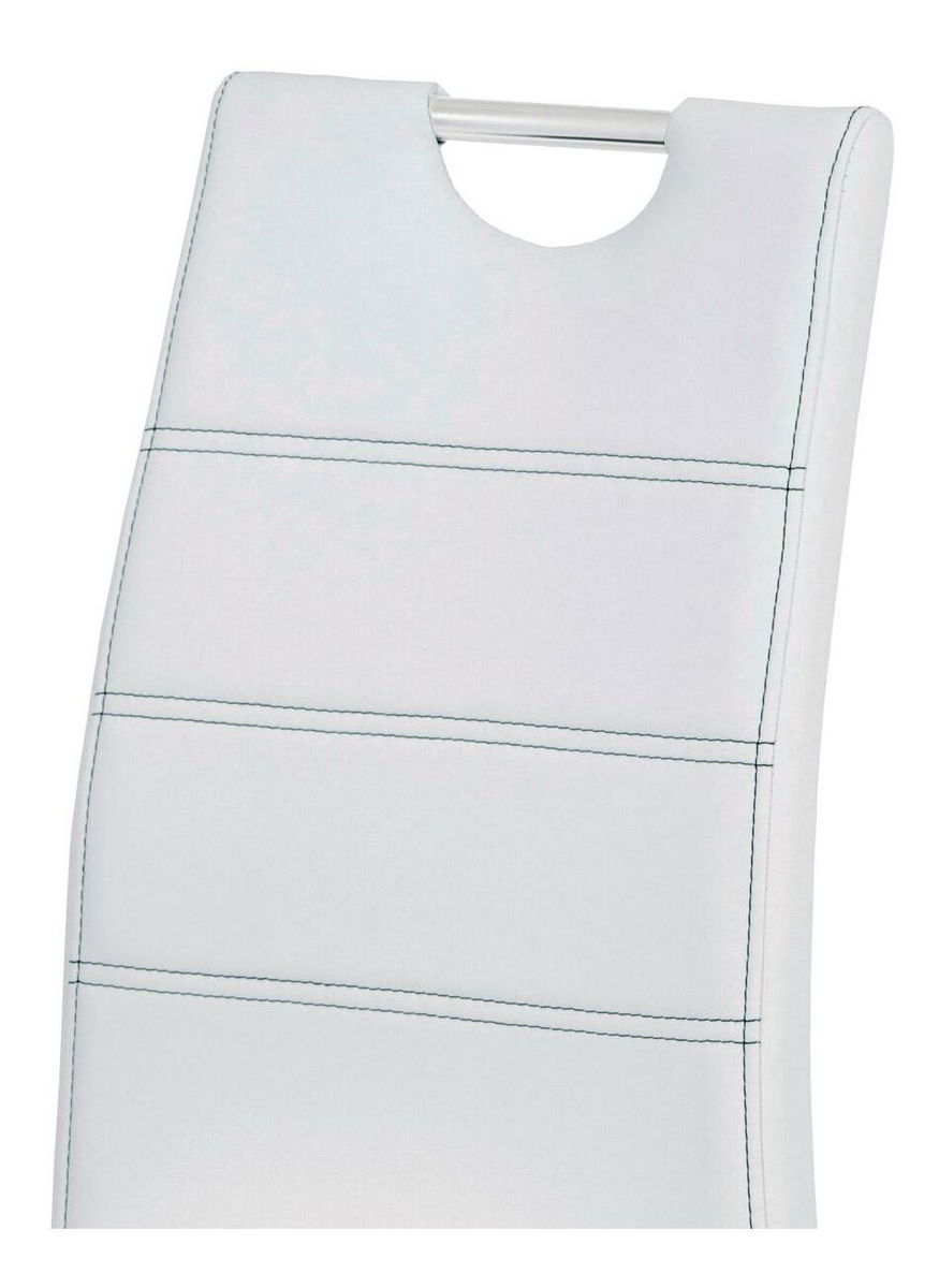ZobrazitModerní jídelní židle je čalouněna bílou ekokůží s dekorativním černým prošitím sedáku i opěradla. Moderní vzhled podtrhuje kovová pohupová podnož s chromovou úpravou. Podnož je navíc speciálně tvarována pro lepší stabilitu a bezpečí a je na šesti černých plastových kluzácích, které sníží riziko poškození Vaší podlahy. Pro snazší manipulaci má židle i madlo v horní části opěradla, které je kovové a také s chromovou úpravou. Nosnost židle je až 110 kg.
