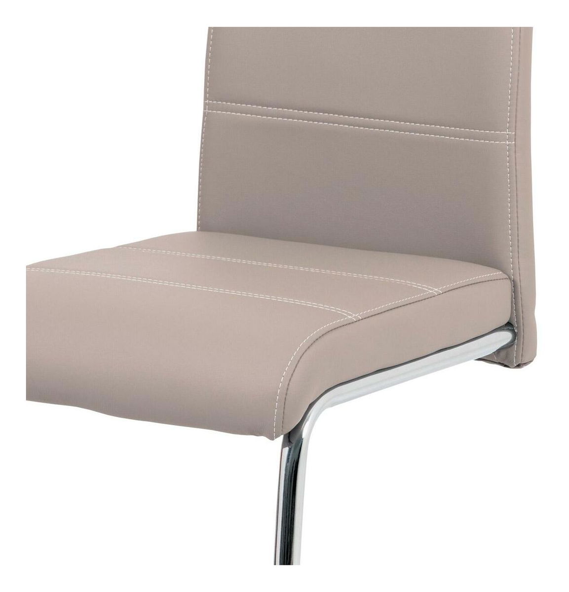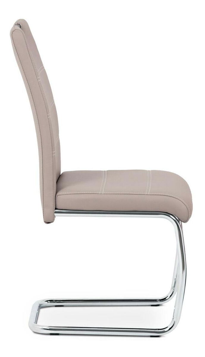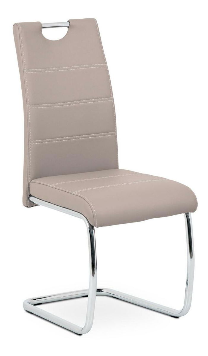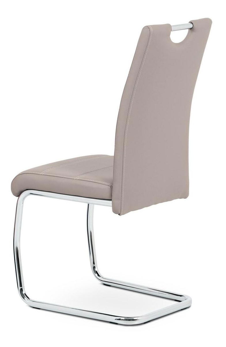 ZobrazitModerní jídelní židle je čalouněna ekokůží lanýžové barvy s dekorativním bílým prošitím sedáku i opěradla. Moderní vzhled podtrhuje kovová pohupová podnož s chromovou úpravou. Podnož je navíc speciálně tvarována pro lepší stabilitu a bezpečí a je na šesti černých plastových kluzácích, které sníží riziko poškození Vaší podlahy. Pro snazší manipulaci má židle i madlo v horní části opěradla, které je kovové a také s chromovou úpravou. Nosnost židle je až 110 kg.