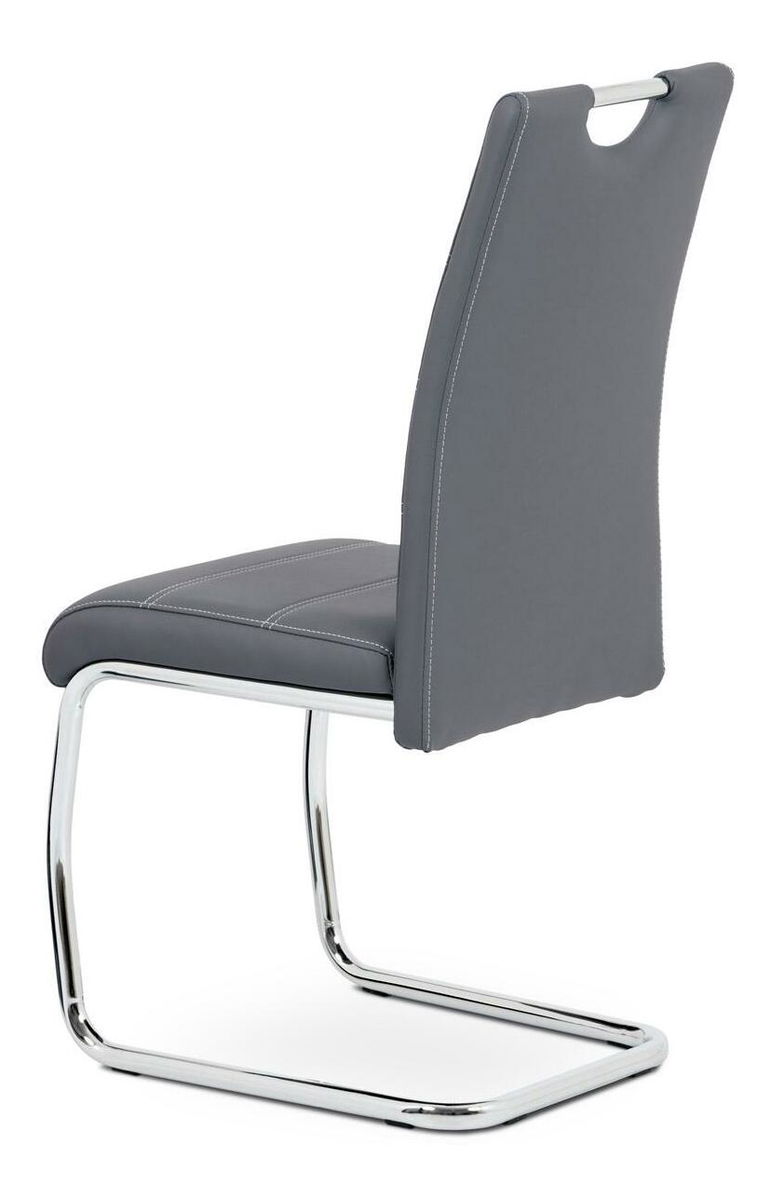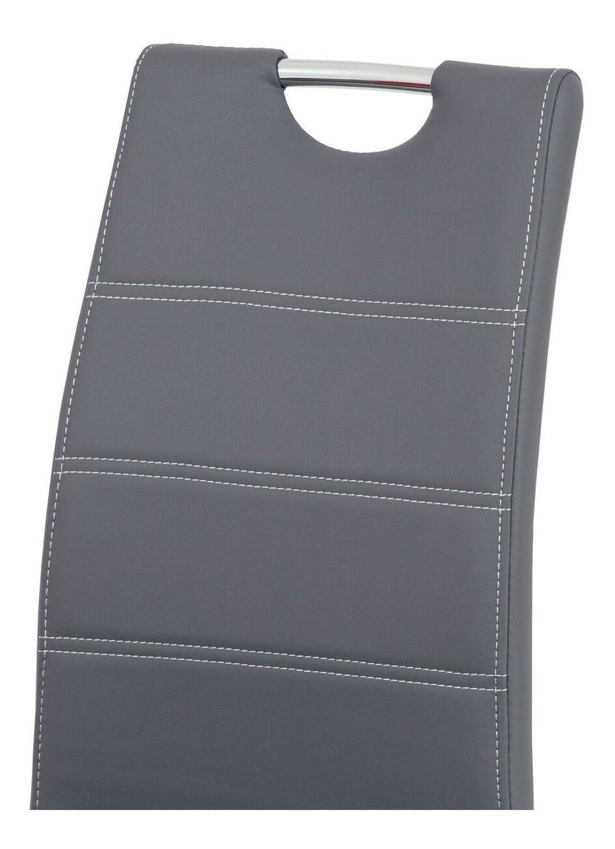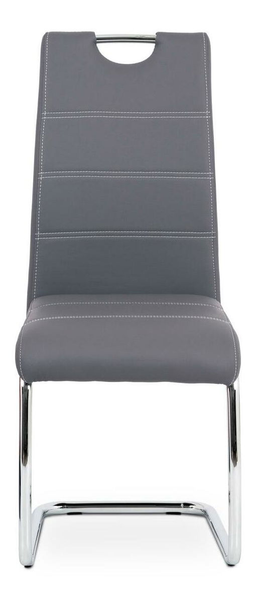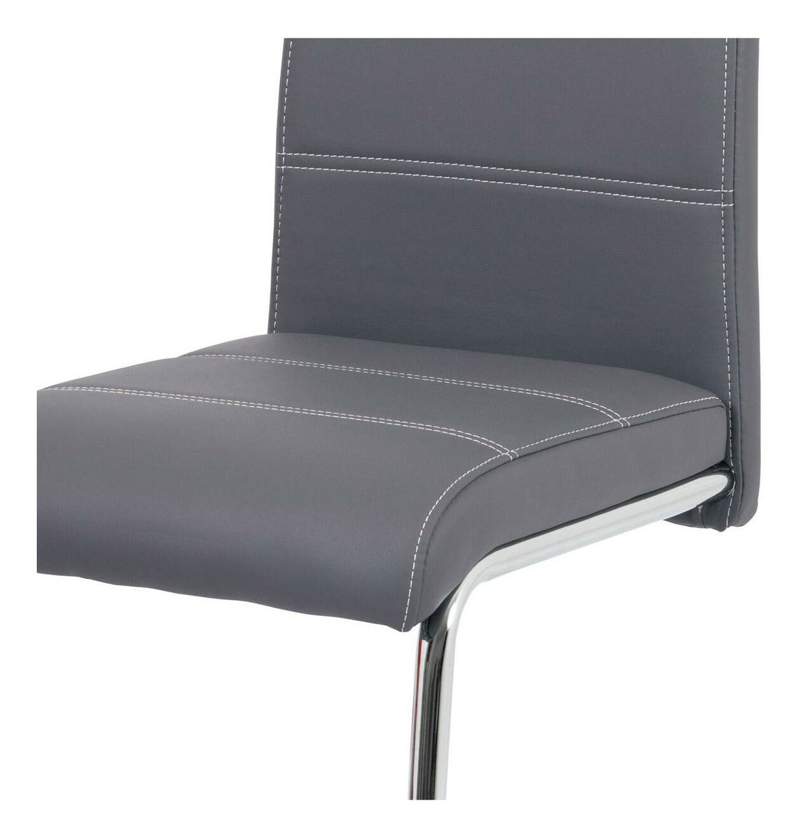 ZobrazitModerní jídelní židle je čalouněna šedou ekokůží s dekorativním bílým prošitím sedáku i opěradla. Moderní vzhled podtrhuje kovová pohupová podnož s chromovou úpravou. Podnož je navíc speciálně tvarována pro lepší stabilitu a bezpečí a je na šesti černých plastových kluzácích, které sníží riziko poškození Vaší podlahy. Pro snazší manipulaci má židle i madlo v horní části opěradla, které je kovové a také s chromovou úpravou. Nosnost židle je až 110 kg.