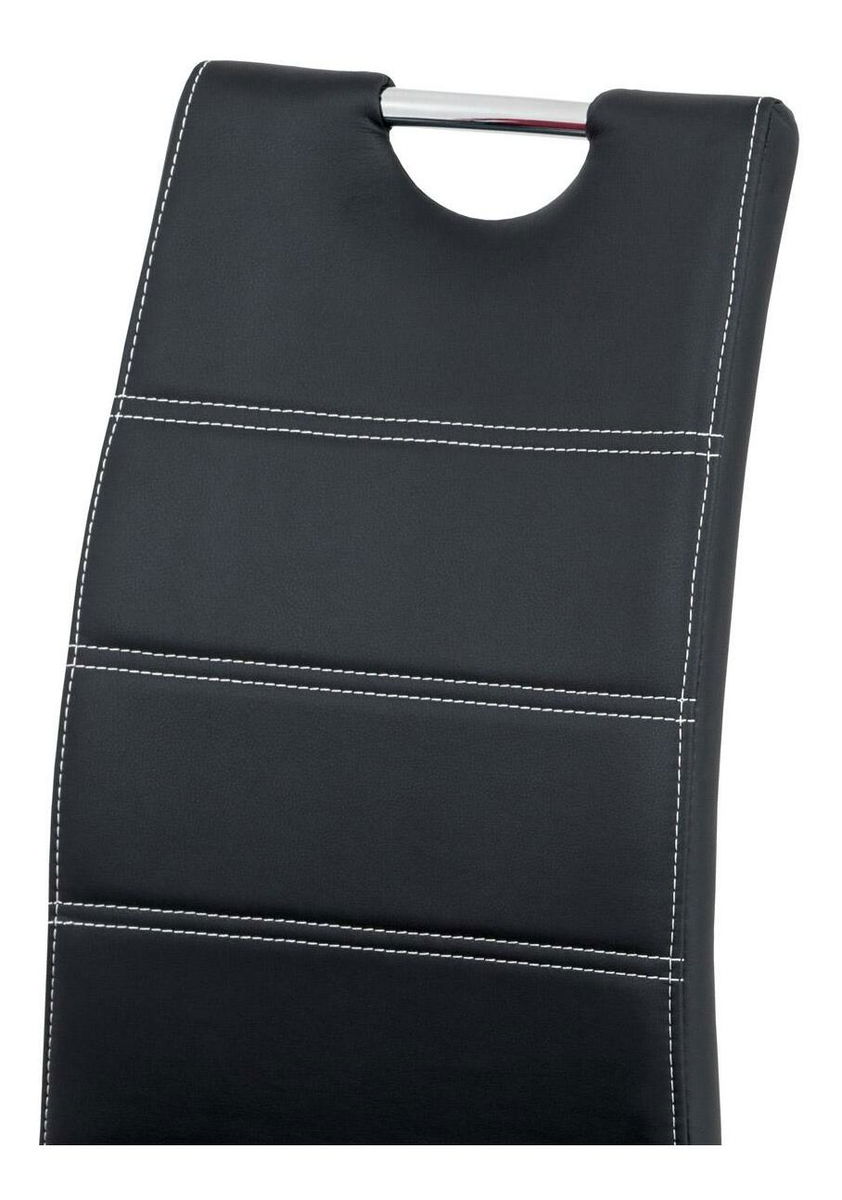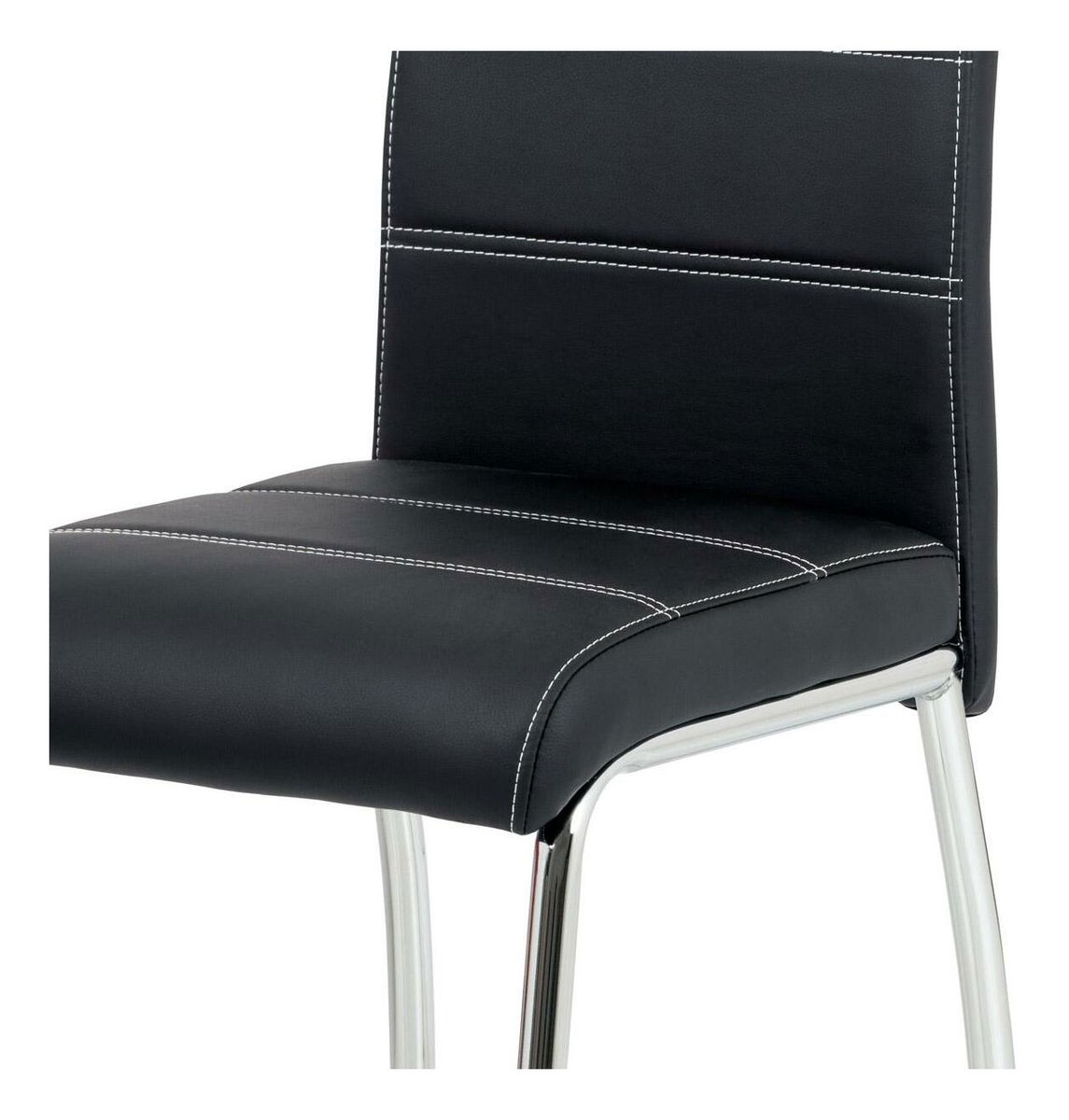 Jídelní židle v moderním stylu. Potah je z černé ekokůže, s bílým horizontálním a obvodovým prošitím opěradla i sedáku. Polstrování je z PU pěny. Moderní vzhled podtrhuje kovová čtyřnohá podnož s chromovou úpravou. Je kruhového průřezu a na konci nohou jsou plastové kluzáky, které sníží riziko poškození Vaší podlahy na minimum. Pro snazší manipulaci má židle i kovové madlo v horní části opěradla. Nosnost židle je až 110 kg. Díky snadno čistitelnému potahu je židle vhodná do kuchyní a jídelen.