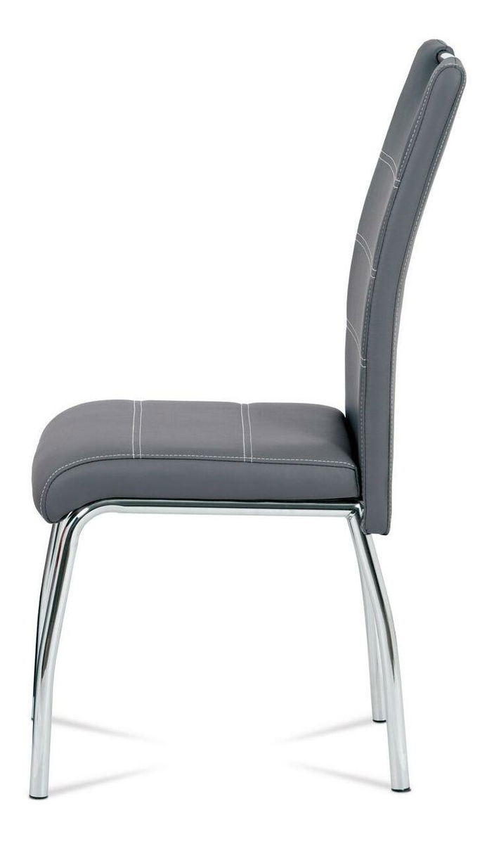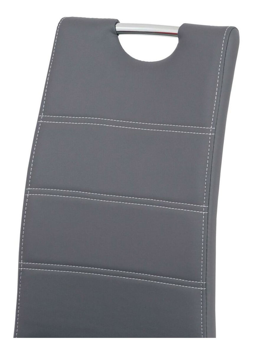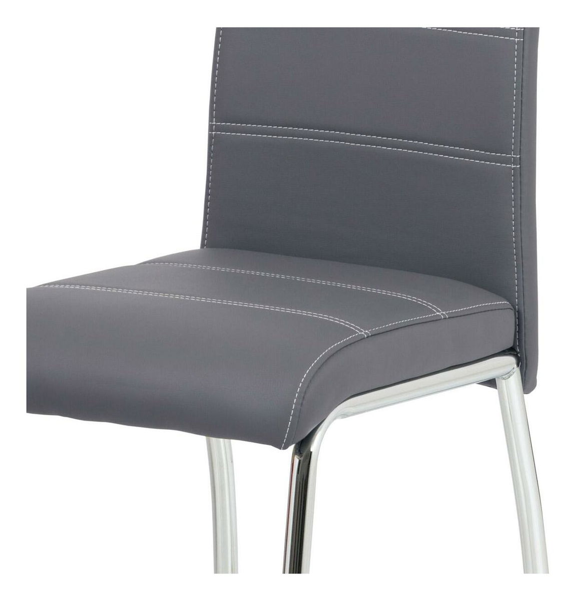 Jídelní židle v moderním stylu. Potah je z šedé ekokůže, s bílým horizontálním a obvodovým prošitím opěradla i sedáku. Polstrování je z PU pěny. Moderní vzhled podtrhuje kovová čtyřnohá podnož s chromovou úpravou. Je kruhového průřezu a na konci nohou jsou plastové kluzáky, které sníží riziko poškození Vaší podlahy na minimum. Pro snazší manipulaci má židle i kovové madlo v horní části opěradla. Nosnost židle je až 110 kg. Díky snadno čistitelnému potahu je židle vhodná do kuchyní a jídelen.