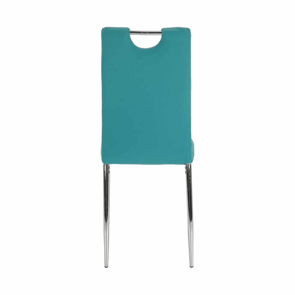 Pěkná jídelní židle, která má zaoblené opěradlo s výřezem ve vrchní části a zaoblené chromové nožičky. Barevné provedení židle je petrolejová modrá. Výška sezení je 45,5 cm.
