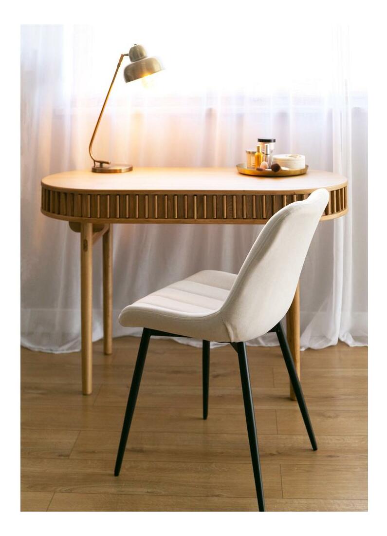 ZobrazitČalouněná židle krémové barvy je stylový model, který dodá vaší jídelně charakter a barvu. Čalounění je vyrobeno z jemného sametu krémové barvy. Židle má na korpusu vertikální prošívání, které jí dodává nejen estetickou úpravu, ale zároveň zdůrazňuje její moderní design. Tenké, vysoké nohy vyrobené z kovu zajišťují stabilitu a odolnost židle. Jejich minimalistický vzhled dokonale kontrastuje s ozdobným čalouněním. Pohodlné sedátko a opěradlo židle zajišťují pohodlí při dlouhodobém používání. Sametové čalounění je měkké a příjemné na dotek, díky čemuž je trávení času na této židli mimořádně pohodlné Správně profilované tělo zvýší komfort používání Detaily produktu: potah je vyroben z látky Matt velvet 06, subtilní krémový korpus a nedotčené černé nohy vytvářejí spojení, na které se nelze zapomenout, čalounění je ze sametového materiálu, jemně se třpytí a je odolné vůči oděru, díky absenci područek se židle perfektně zasouvají pod stolovou desku standardní výšky, zkosené spodky nožičky zajišťují nepoškrábání na podlaze, kvé nožičky zaručují nábytku správnou stabilitu.