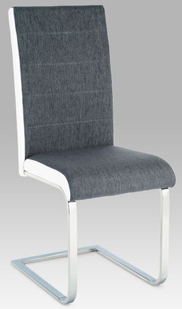 Honosně působící jídelní židle s nohama v provedení chrom, šedou látkou na sedáku a opěradle, boky jsou v kožence bílé barvy.