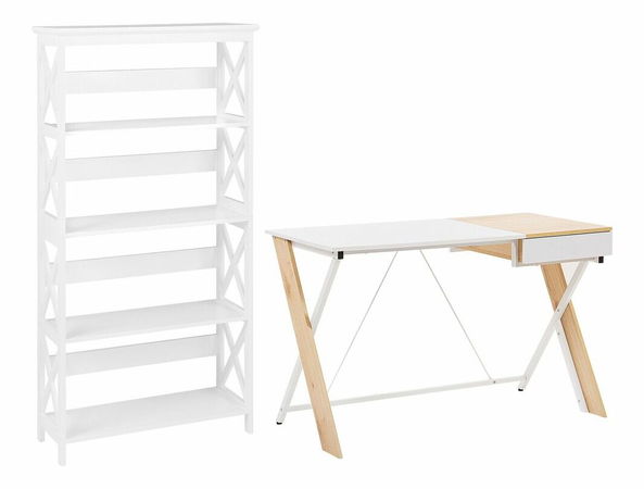 Vytvořte si domácí pracovnu, která vám pomůže soustředit se na každodenní povinnosti a zároveň se stane stylovou součástí interiéru. Psací stůl navržený s širokou deskou as funkční zásuvkou je umístěn na křížovém kovovém rámu. Nabízí dostatek prostoru pro notebook, knihy, psací potřeby či stolní lampu. Knihovna z MDF materiálu, která je součástí sestavy, vyniká čistými liniemi, bílou povrchovou úpravou a geometrickým designem. Tento kousek nesmí chybět žádnému milovníkovi interiérového designu. Univerzální barevná kombinace bílé a světlého dřeva dodává této sadě skandinávský nádech a hodí se k různým stylům interiérového zařízení.