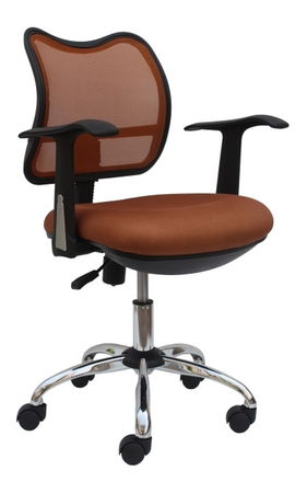 Elegantní kancelářské křeslo na černých kolečkách s látkovým potahem sedáku, plastovými područkami, pochromovaným podstavcem (křížem), síťovanou opěrkou na záda v provedení světlehnědá barva. Nosnost 100 kg.