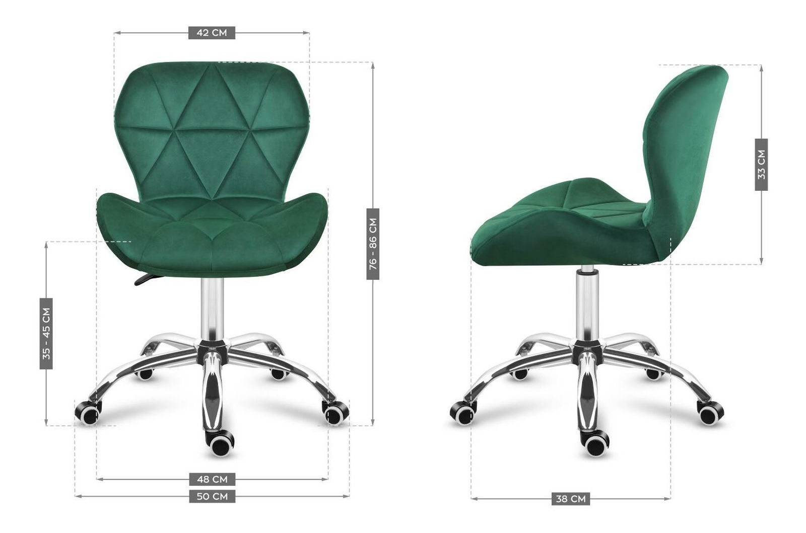 Kombinace módní sametové látky, tvarovaného tvaru a chromového základu dodává eleganci, vyzdvihuje modernost a potvrzuje vysokou kvalitu. Vhodné tvary na sedáku a opěradle zajišťují měkkost a tím i maximální komfort. Speciální, měkká pěna a tzv. studená pěna je čalouněna kvalitním sametem. Tyto materiály zajišťují přiměřenou prodyšnost, odolnost proti deformaci a komfort sezení i po mnoha hodinách práce za počítačem. Polyuretanovo-gumová dvojitá kolečka o průměru 50 mm, vyrobená ze speciálního materiálu, ochrání podlahu před škrábanci a oděrkami. Ocelová podnož dokonale zapadá do moderního designu.