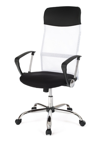 Jednoduchá kancelářská židle s bílou síťovanou opěrkou na záda a černou látkou na sedáku. Židle má kovový kříž v chromové barvě. Zvedací mechanismus je plynový píst. Houpací mechanismus je strandard. Černé područky.