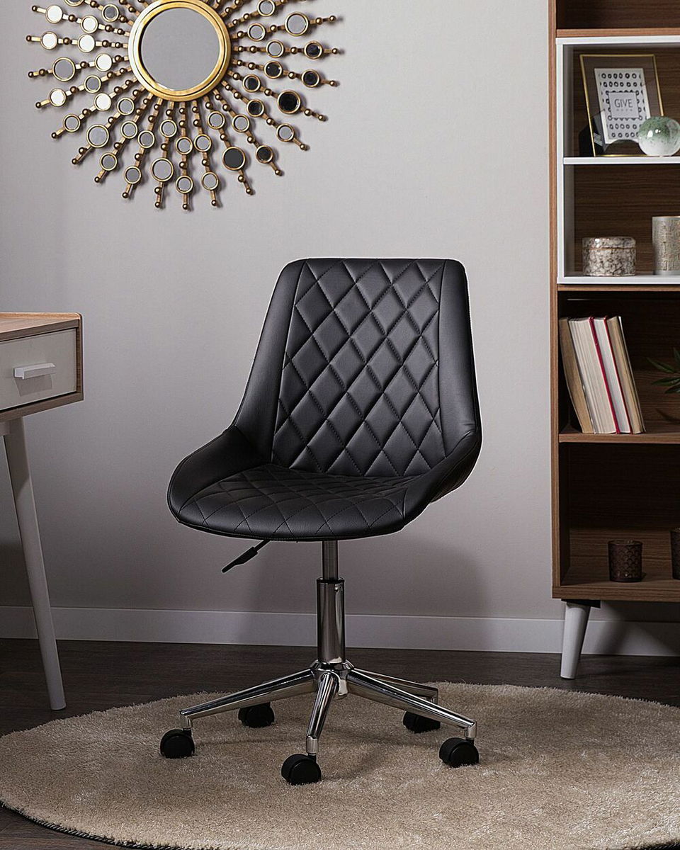 Tato židle s čalouněním z umělé kůže zvýrazní interiér v elegantním, tradičním nebo moderním stylu. Ozdobné prošívání na černém čalounění a lesklá kovová podnož dohromady vytvářejí design, který je ideální do prostor v různých stylech. Židle má měkkou pěnovou výplň, kolečka a plynový zdvih, takže je velmi pohodlná a vhodná pro dlouhé hodiny strávené při práci.
