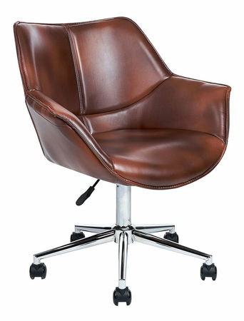 Dopřejte si pohodlné sezení při práci s touto mimořádně stylovou kancelářskou židlí s nadčasovým designem. Hnědé sedátko čalouněné umělou kůží má zajímavé prošívání, díky kterému vypadá elegantně a luxusně. Široké profilované opěrky rukou zaručují vynikající komfort během používání. Díky stabilní podnoži vyrobené z kovu v klasickém chromovaném provedení s kolečky lze nastavit výšku židle dle potřeb.