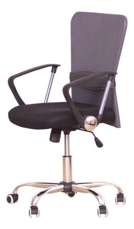 Moderní kancelářská židle nejen dokonale zapadne do interiéru, ale Vám poskytne i pohodlné sezení. Potah se vyrábí z látky v kombinaci s prodyšnou síťkou. Růžice je z chromu a područky jsou kombinací chromu a plastu černé barvy. Pogumovaná kolečka jsou vhodné na plovoucí a dřevěné podlahy. Opěrky se vyrábějí v pěti barevných variacích: černá, červená, modrá, šedá a zelená. Pomocí páčky umístěné pod sedákem je možnost nastavení hloubky sedu v rozmezí 45-55 cm. Nosnost je do 110 kg.