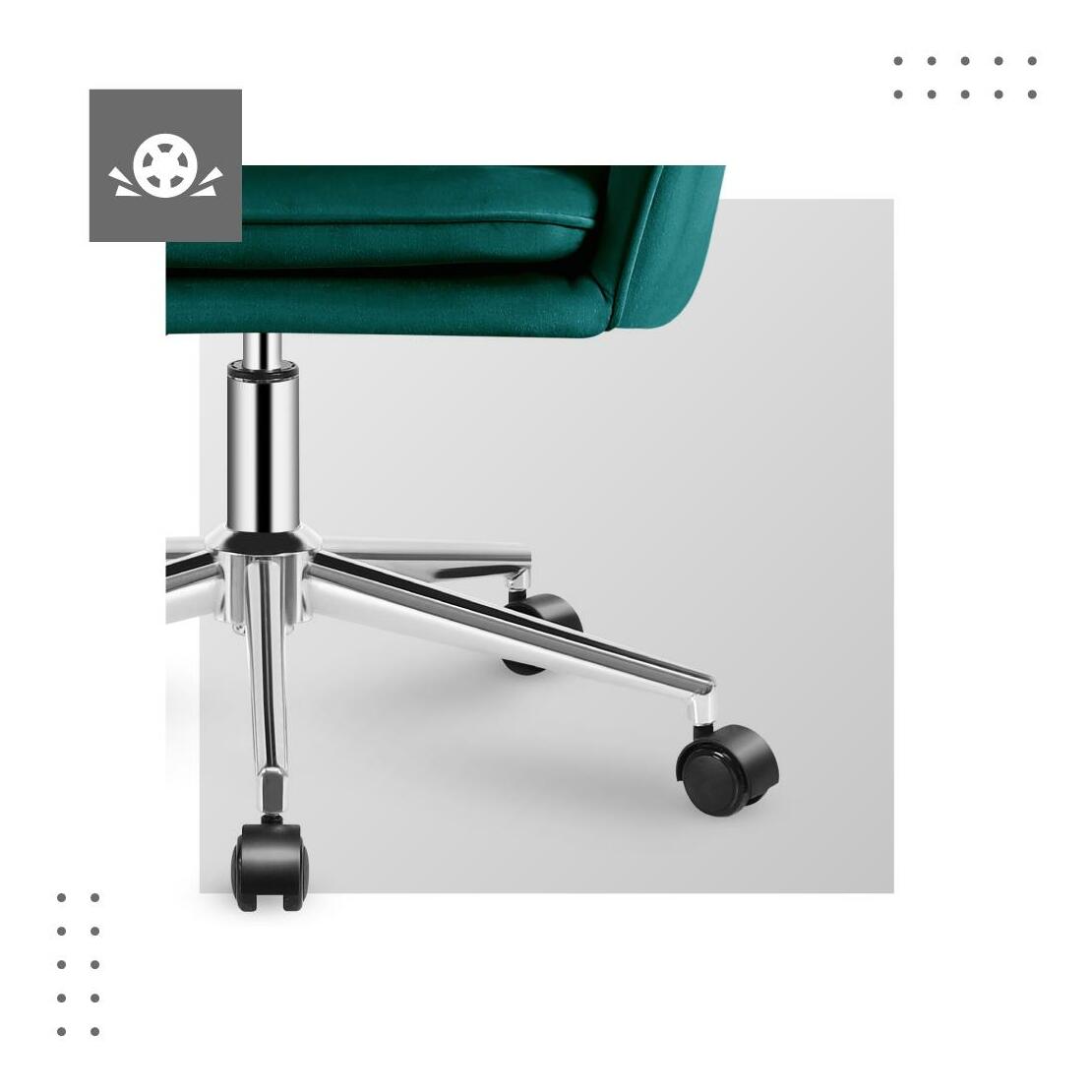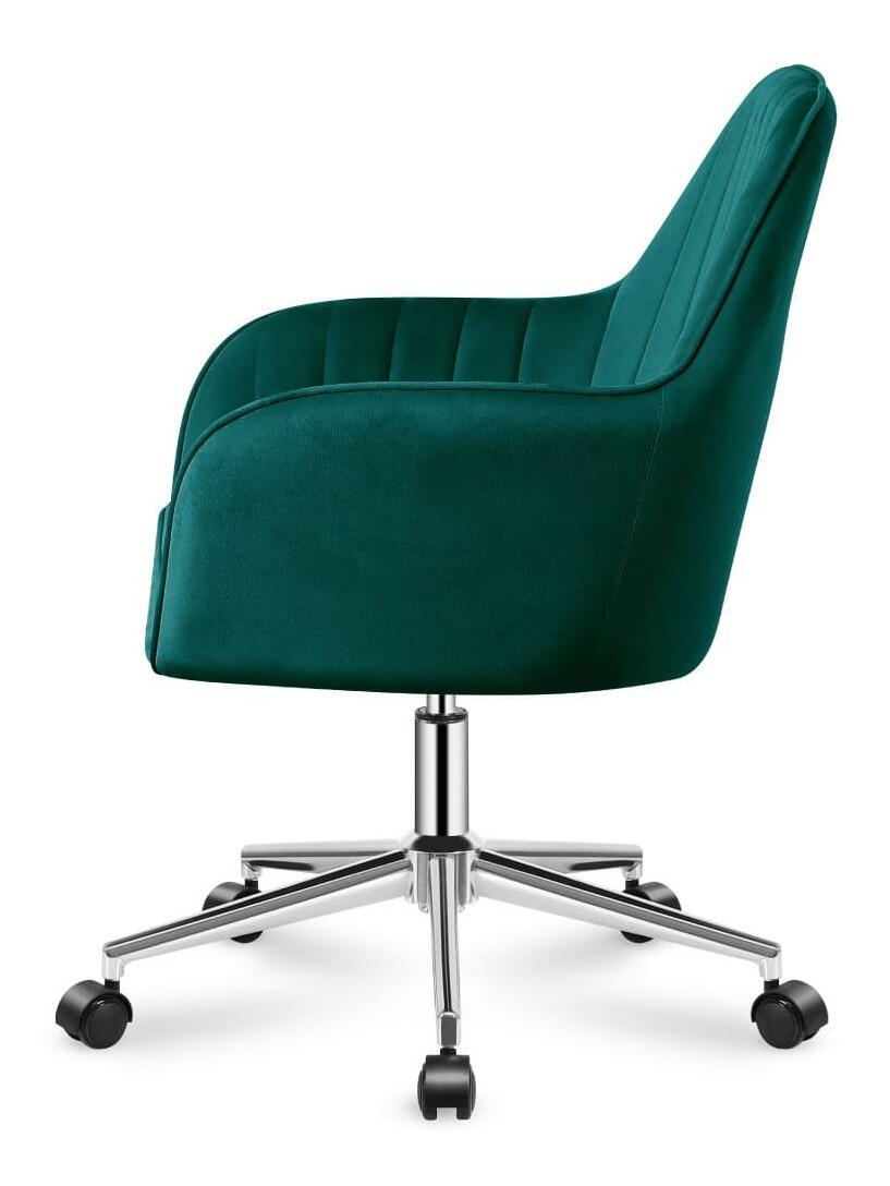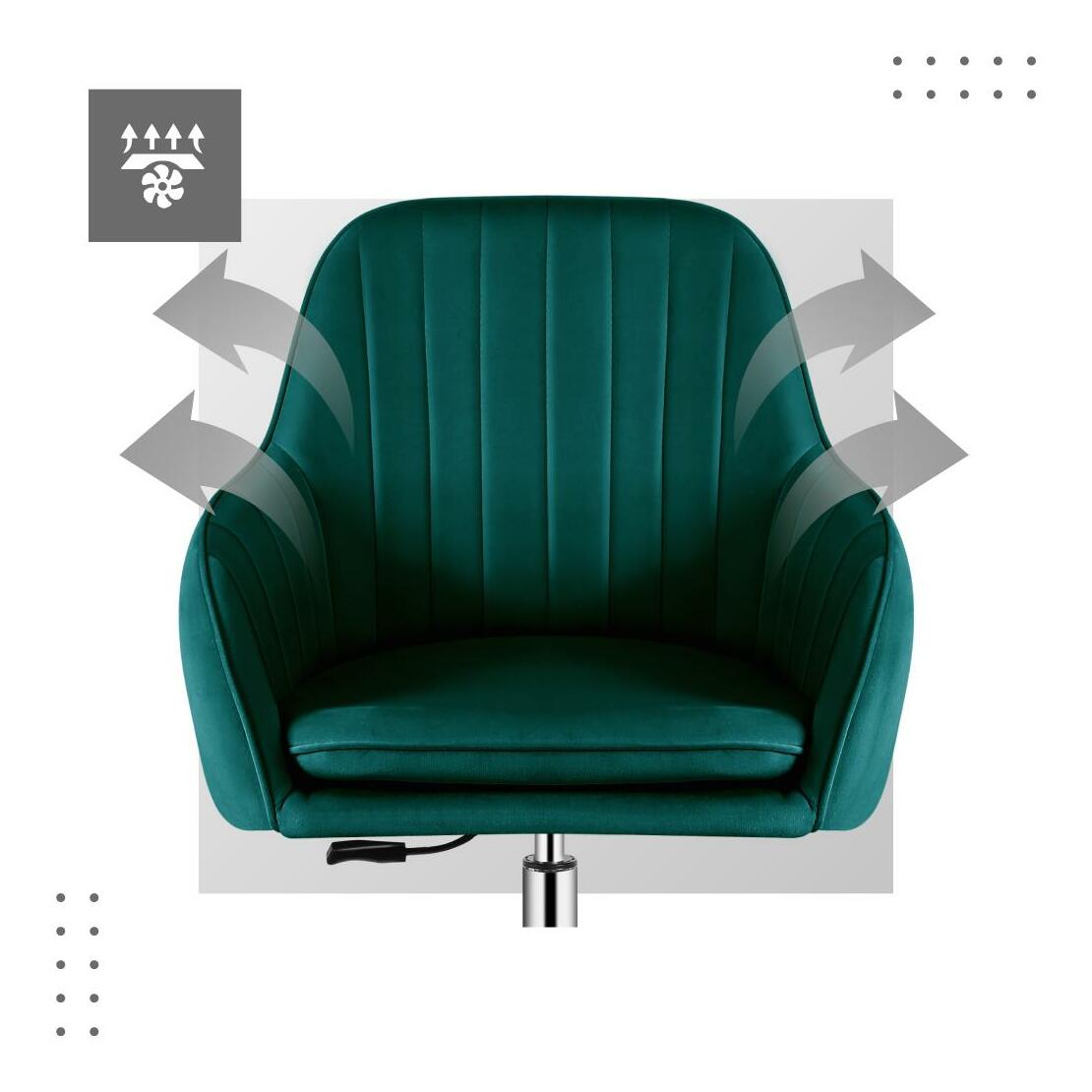 Kombinace módní sametové látky, tvarovaného tvaru a chromového základu dodává eleganci, vyzdvihuje modernost a potvrzuje vysokou kvalitu. Vhodné tvary na sedáku a opěradle zajišťují měkkost a tím i maximální komfort. Švy na opěradle křesla jsou nejen praktické, ale také dekorativní a zdůrazňují jedinečný tvar nábytku. Profilované sedátko zajišťuje měkkost a pohodlí. Díky tomu nebude problém ani mnohohodinové sezení. Odnímatelný polštář usnadňuje udržování křesla v čistotě. Dvojitá kolečka o průměru 50 mm, vyrobená ze speciálního materiálu, ochrání podlahu před škrábanci a oděrkami. Ocelová podnož dokonale zapadá do celkového designu, usnadňuje pohyb a správně stabilizuje celé křeslo.