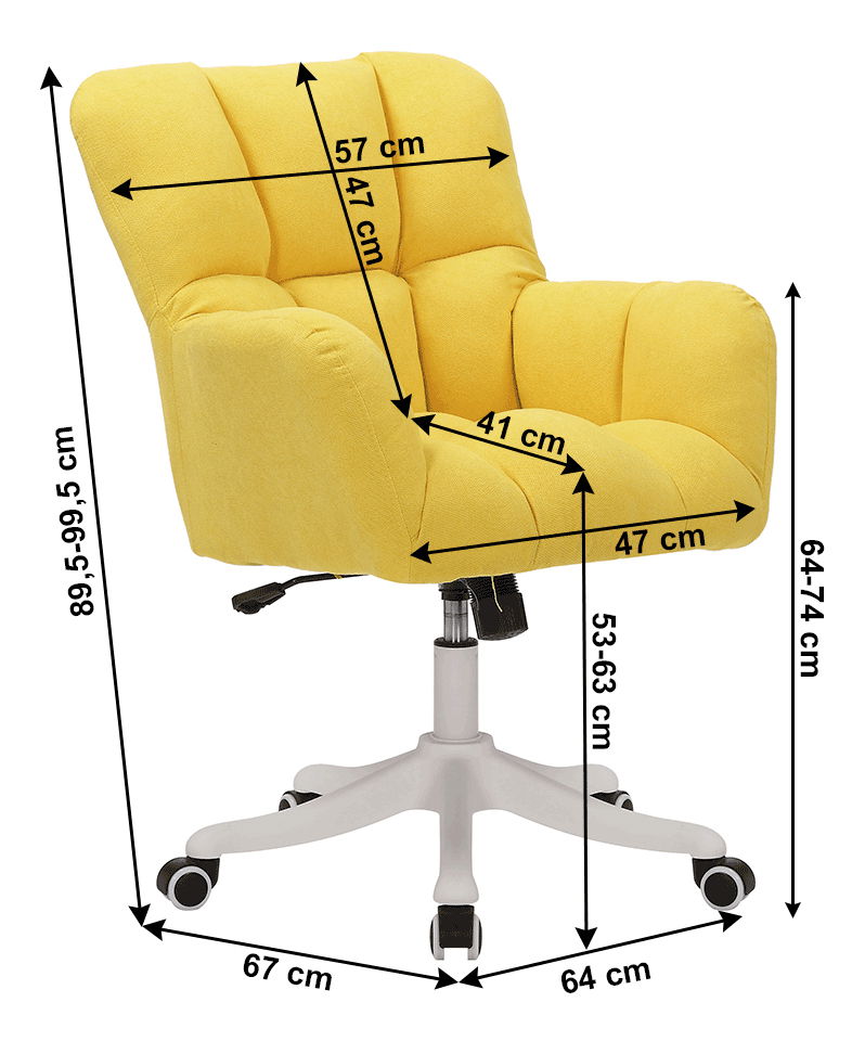 Kancelářské křeslo Gorman (žlutá) je výškově nastavitelné a designové kancelářské křeslo vhodné pro každého uživatele. Materiál z kovu a oděruodolné látky zajišťuje dlouhou životnost produktu. Židle je nosná a vydrží až 110 kg. Výška sedu lze nastavit od 53 do 63 cm, hloubka sedu je 41 cm a šířka sedu je 37 cm. Zádová opěrka má výšku 47 cm a šířku 57 cm. Křeslo má funkci houpání. Pogumovaná kolečka jsou vhodná pro dřevěné a plovoucí podlahy.