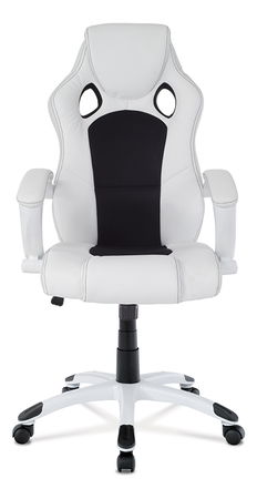 Elegantní kancelářské křeslo vyrobené z koženky bílé barvy v kombinaci s látkou typu mesh v černé barvě. Kříž a područky jsou ve vysokém bílém lesku, houpací mechanismus, plynový píst.