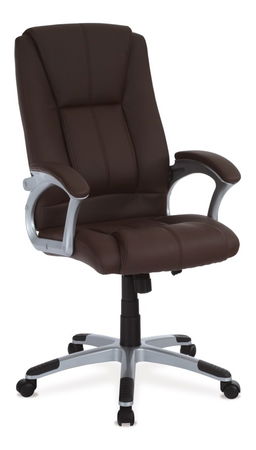Klasické kancelářské křeslo vyrobené z koženky v hnědé barvě. Pevné područky s čalouněním, stříbrný kříž, houpací mechanismus a plynový píst.