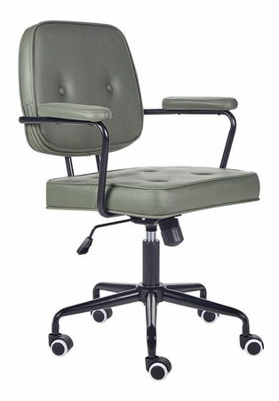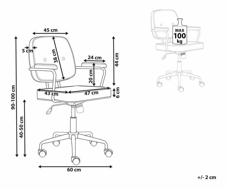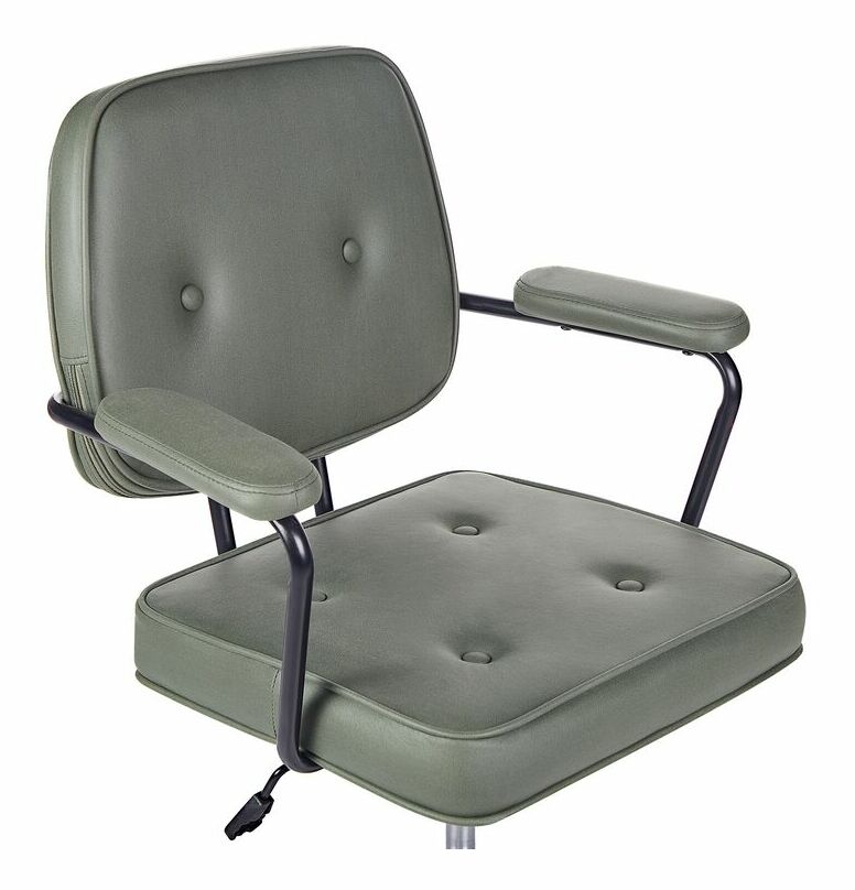 Osvěžte vzhled svého pracovního prostoru pomocí této funkční kancelářské židle. Je vybavena 360° otočným mechanismem, jakož i plynovým zdvihacím mechanismem, který umožňuje nastavit výšku podle vašich preferencí. Židle je čalouněna odolnou umělou kůží a její opěradlo je zdobeno knoflíky, které jí dodávají elegantní vzhled. Díky pochromovaným kovovým nohám a podstavci je tento kus stabilní a odolný. Židle krásně vynikne v tradičních i moderních interiérech.