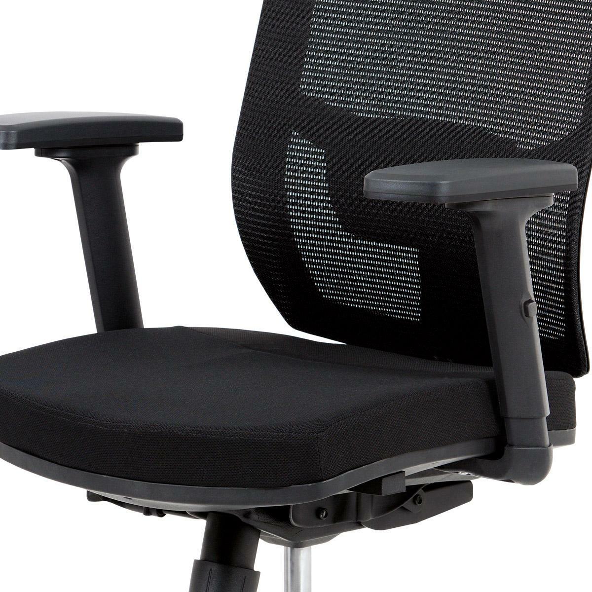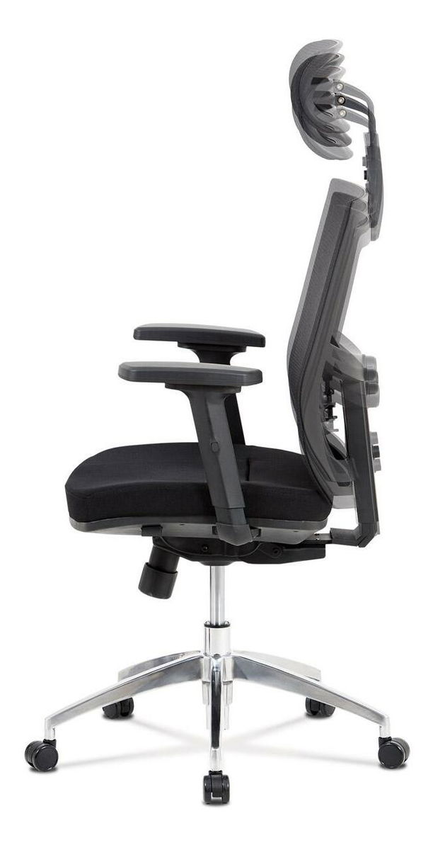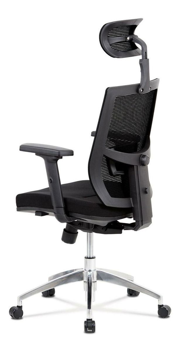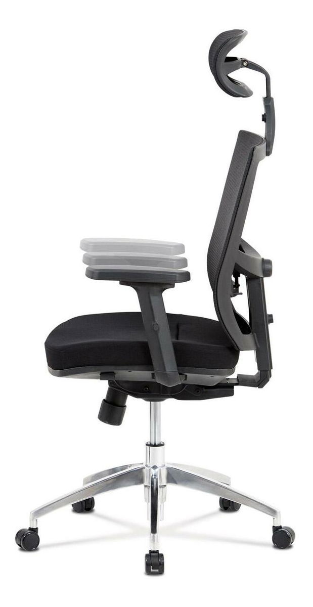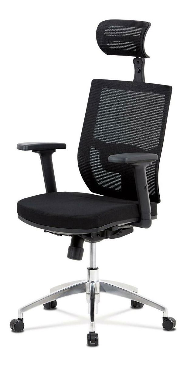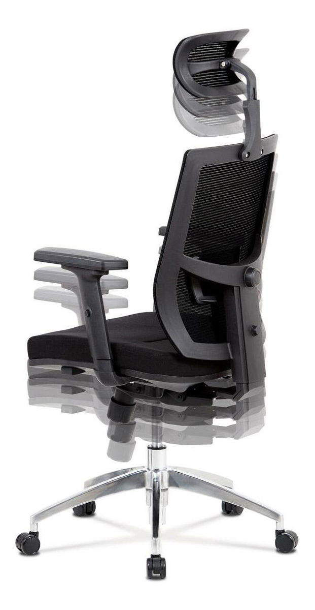 ZobrazitKancelářská židle s opěradlem z černé síťoviny MESH a černým látkovým sedákem. Židle je výškově nastavitelná, vybavena synchronním mechanismem. Plastové područky jsou polohovací a výškově nastavitelné (2D). Výškově nastavitelné je i opěradlo. Díky malé páčce můžete samostatně polohovat sedák dopředu nebo dozadu. Síťovaná, výškově nastavitelná a polohovací opěrka hlavy a nastavitelná bederní opěrka. Kříž z leštěného hliníku s kolečky vhodnými pro tvrdé typy podlah.
