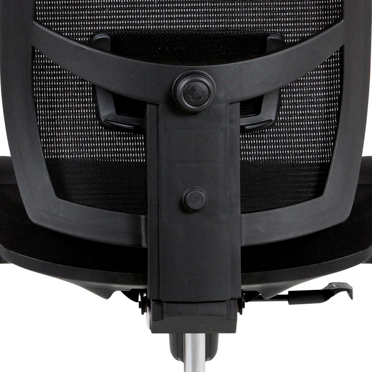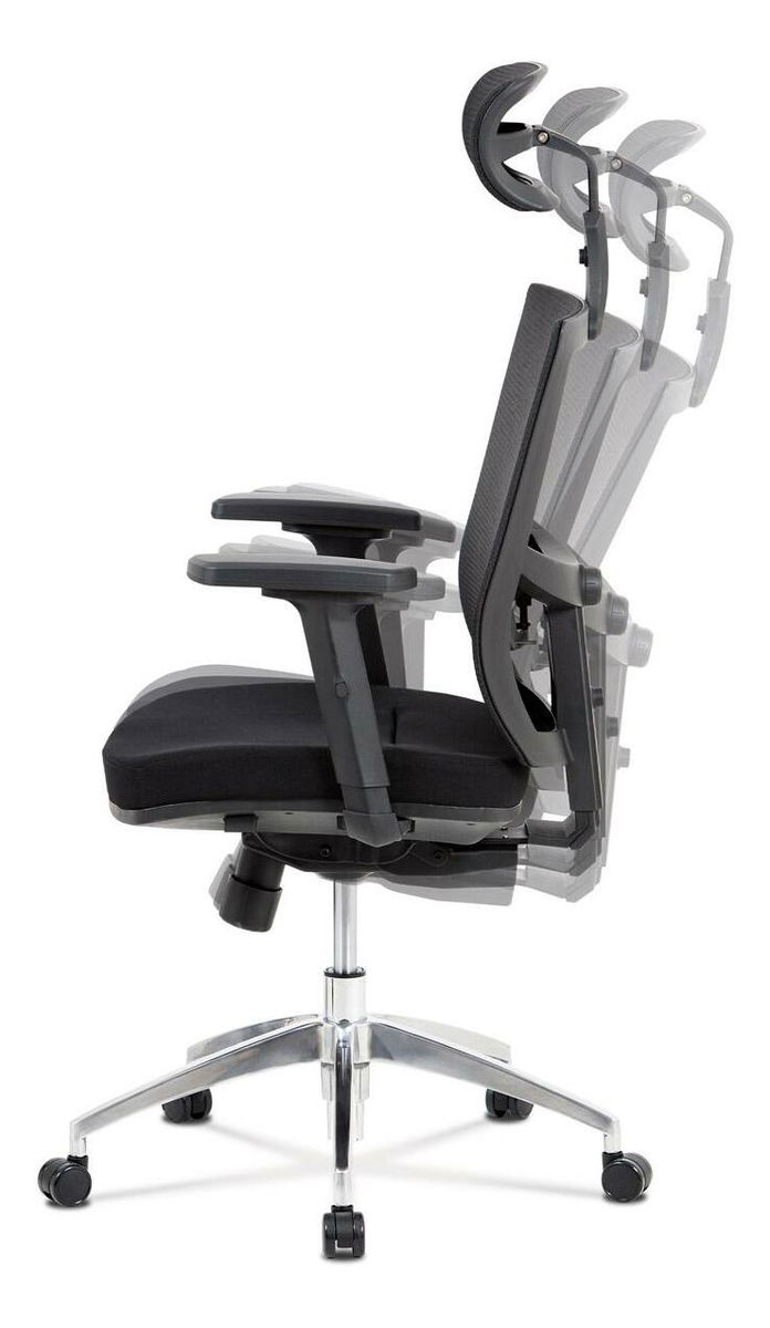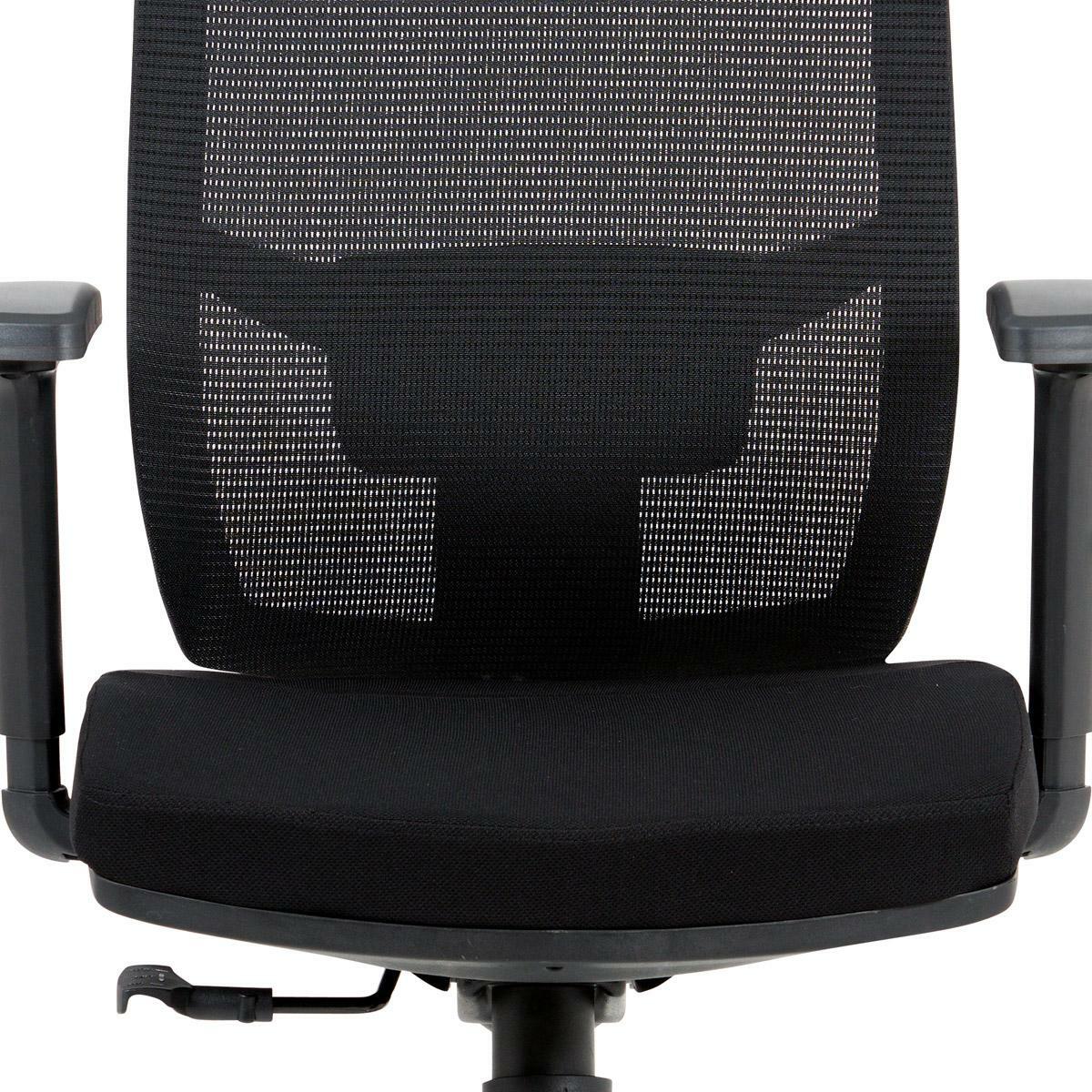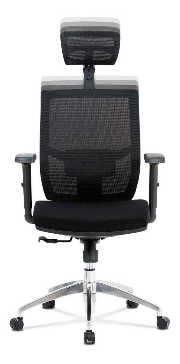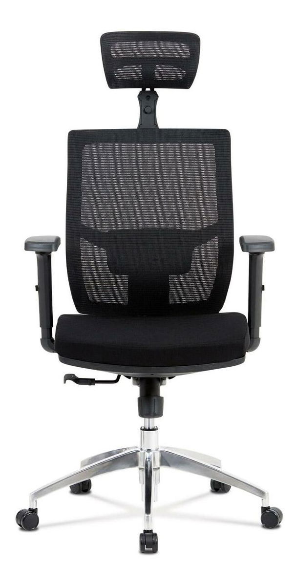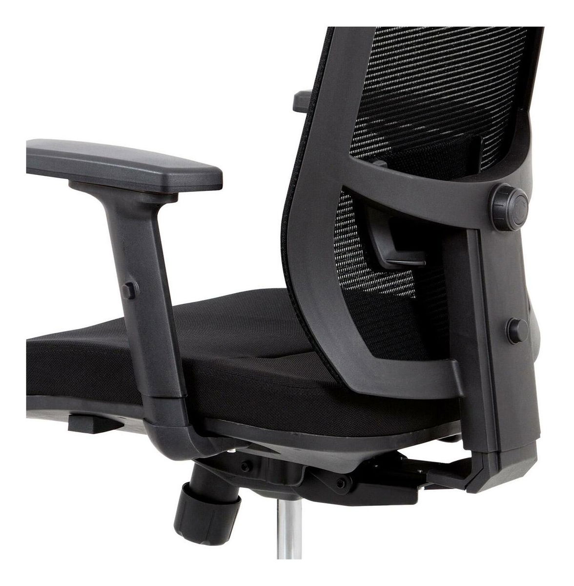 ZobrazitKancelářská židle s opěradlem z černé síťoviny MESH a černým látkovým sedákem. Židle je výškově nastavitelná, vybavena synchronním mechanismem. Plastové područky jsou polohovací a výškově nastavitelné (2D). Výškově nastavitelné je i opěradlo. Díky malé páčce můžete samostatně polohovat sedák dopředu nebo dozadu. Síťovaná, výškově nastavitelná a polohovací opěrka hlavy a nastavitelná bederní opěrka. Kříž z leštěného hliníku s kolečky vhodnými pro tvrdé typy podlah.