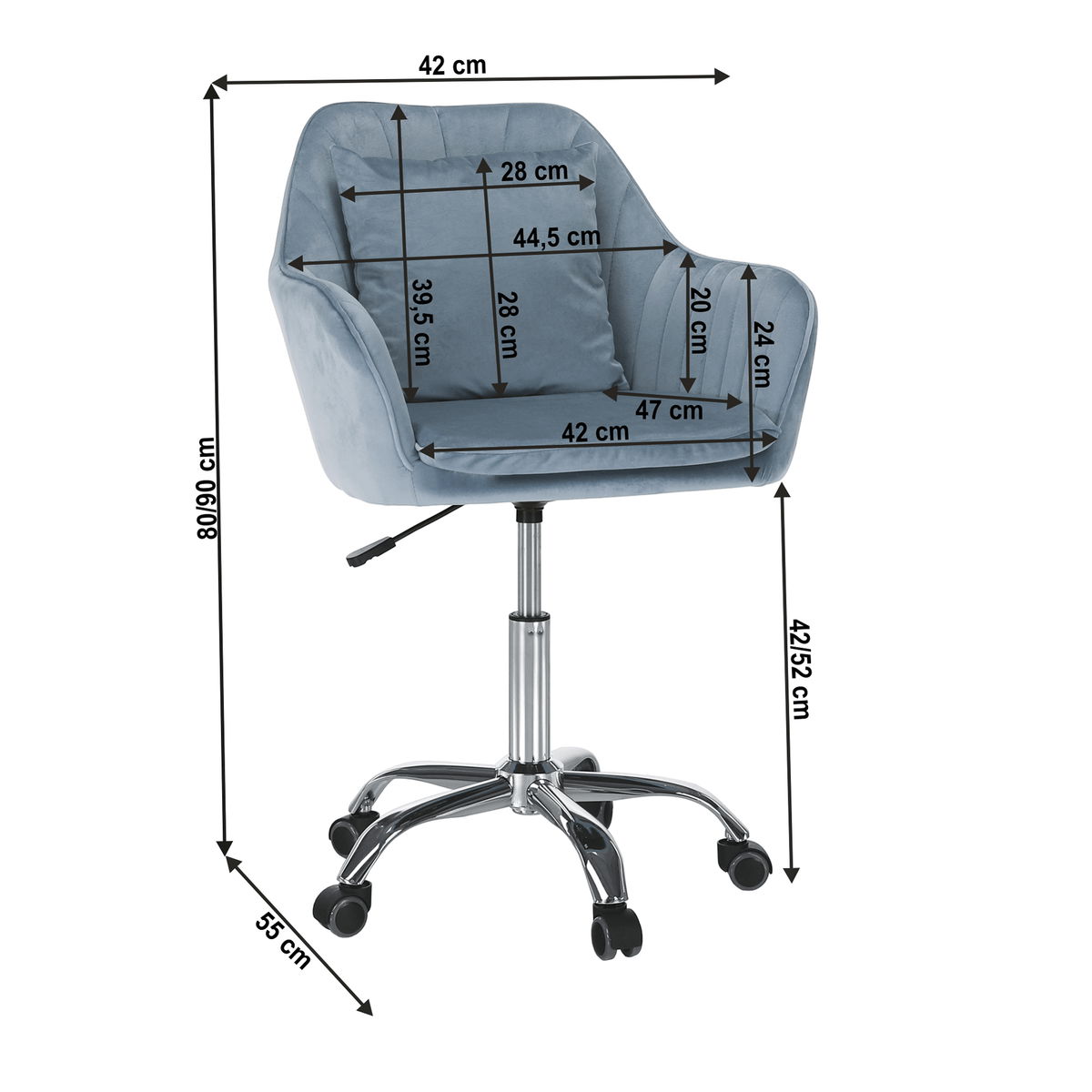 Kancelářské křeslo Siegen je designové otočné křeslo s nastavitelnou výškou sedu. Je vyrobeno z chromu a odolné Velvet látky v modré barvě. Křeslo má nosnost až 100 kg a výšku sedu lze nastavit v rozmezí 42-52 cm. Hloubka sedu je 47 cm a opěrka zad má rozměry 44,5x39,5 cm. Šířka sedu je 42 cm a opěrka na ruce lze nastavit v rozmezí 20-24 cm. Polštář křesla má rozměry 28x28 cm. S tímto křeslem získáte nejen pohodlí, ale také stylový doplněk do vaší kanceláře.