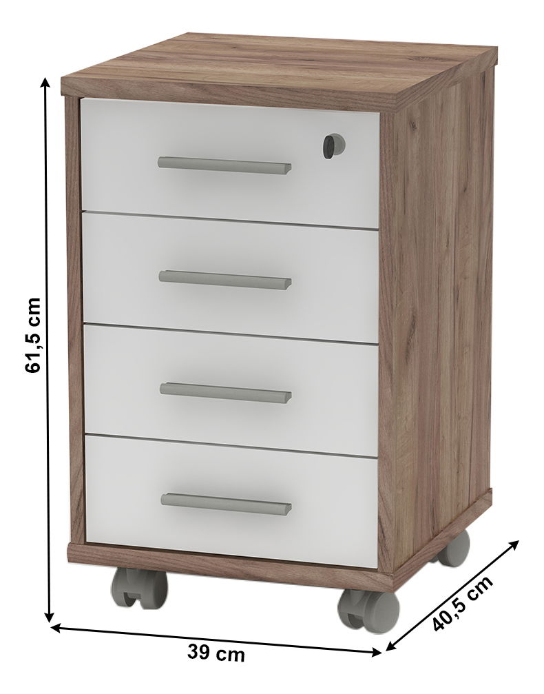 Kancelářský kontejner se zámkem Hansa 2 NEW 12 (kraft dunkel + bílá) o výšce 61,5 cm, šířce 39 cm a hloubce 40,5 cm pomůže udržet pracovní prostředí v pořádku. Jednoduchý design a praktičnost tohoto kontejneru okouzlí každého. Kontejner obsahuje čtyři zásuvky, přičemž nejvyšší zásuvka je uzamykatelná a umožňuje ukládání cenných předmětů. Výhodou je i jeho pohyblivost po prostoru díky čtyřem kolečkům. Kancelářský kontejner se zámkem Hansa 2 NEW 12 je ideální volbou pro každého, kdo hledá praktické a funkční řešení pro svou kancelář.