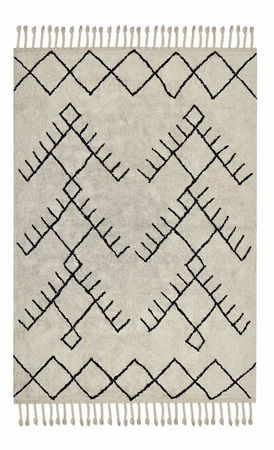 Tento koberec zútulní váš interiér a příjemně doplní jeho vzhled. Je vyroben z bavlny, takže je nejen odolný, ale také příjemný na dotek. Koberec je ozdoben třásněmi a černým geometrickým vzorem, který kontrastuje s béžovým podkladem.