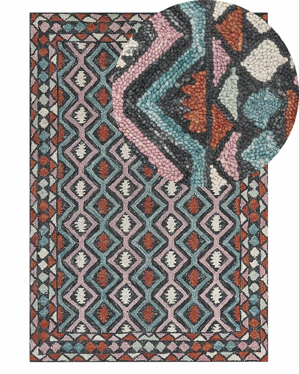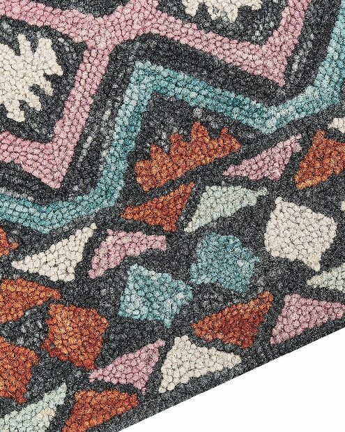 Dodejte svému interiéru jedinečný charakter s výjimečným kobercem, který jistě upoutá pozornost vašich hostů. Tento doplněk s barevným vzorem na černém podkladu pěkně doplní každý moderní nebo boho interiér. Ručně všívaný koberec je vyroben z vysoce kvalitního vlněného vlákna, který mu dodává luxusní vzhled.