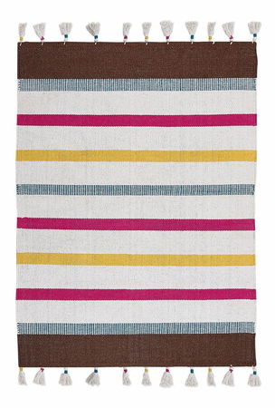 Tento barevný koberec v okamžiku rozzáří celý interiér a stane se zajímavým středem pozornosti. Díky barevným pruhům a ozdobným střapcům je vhodný do interiérů zařízených v různých stylech a hodí se i do dětského pokoje. Je ručně tkaný z kvalitní bavlny.