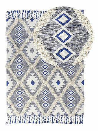 Doplňte vzhled svého obývacího pokoje, ložnice nebo chodby tímto kobercem. Je vyroben z bavlny a má nádherný poutavý geometrický vzor v modro-béžových barvách, který doplňují ozdobné třásně. Díky precizní ruční výrobě je odolný a bude vám sloužit léta.