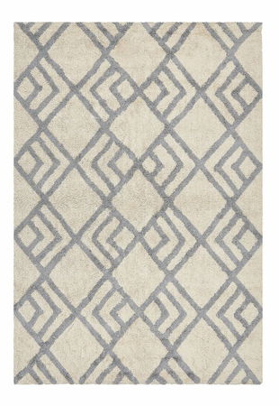 Zútulněte si obývací pokoj tímto světle béžovým kobercem. Vyznačuje se na pohled příjemným geometrickým vzorem v šedé barvě, díky kterému bude vynikat mezi ostatními doplňky. Ručně všívaný koberec je vyroben z bavlny, je výjimečně měkký a odolný. Umístěte jej před pohovku nebo vedle postele a dopřejte svým nohám pohodlí a svému interiéru nový vzhled.