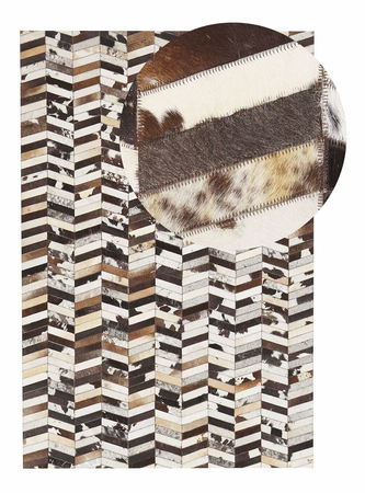 Zlepšete design svého obytného prostoru pomocí tohoto koženého patchworkového koberce. Hnědé, černé a krémově bílé kousky jsou sešity do jednoho celku a vytvářejí trendový vzor. Příjemný a zároveň odolný koberec z hovězí kůže je velmi jemný na dotek a snadno se udržuje, takže je vhodný do obývacího pokoje nebo velké ložnice zařízené v retro stylu.