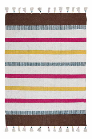 Tento barevný koberec v okamžiku rozzáří celý interiér a stane se zajímavým středem pozornosti. Díky barevným pruhům a ozdobným střapcům je vhodný do interiérů zařízených v různých stylech a hodí se i do dětského pokoje. Je ručně tkaný z kvalitní bavlny.