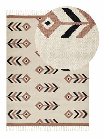 Zkrášlete svůj obývací pokoj nebo ložnici pomocí tohoto krásného koberce, který se hodí do jakéhokoli tradičního i moderního stylu interiéru. Koberec byl tkaný ručně z kvalitní bavlny, díky čemuž je odolný, jeho údržba je nesmírně jednoduchá a vydrží vám dlouhá léta. Zemité barevné odstíny v kombinaci se zajímavým vzorem vnesou do prostoru teplo a hřejivou atmosféru. Koberec je po obou koncích ozdoben třásněmi, které jen umocňují jeho oboustranný design. Tento koberec je dokonalým doplňkem, který spojuje funkčnost, pohodlí a styl.