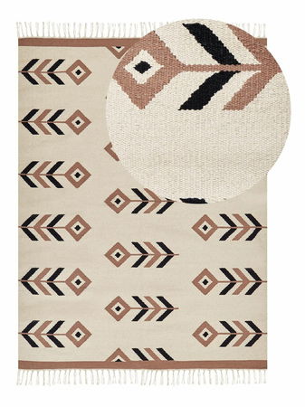 Zkrášlete svůj obývací pokoj nebo ložnici pomocí tohoto krásného koberce, který se hodí do jakéhokoli tradičního i moderního stylu interiéru. Koberec byl tkaný ručně z kvalitní bavlny, díky čemuž je odolný, jeho údržba je nesmírně jednoduchá a vydrží vám dlouhá léta. Zemité barevné odstíny v kombinaci se zajímavým vzorem vnesou do prostoru teplo a hřejivou atmosféru. Koberec je po obou koncích ozdoben třásněmi, které jen umocňují jeho oboustranný design. Tento koberec je dokonalým doplňkem, který spojuje funkčnost, pohodlí a styl.