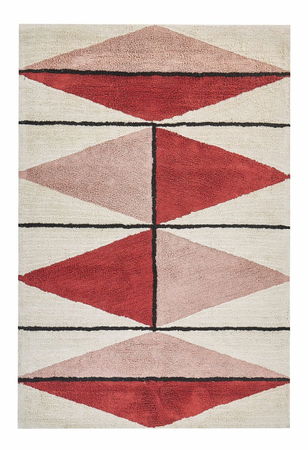 Tento bavlněný koberec je skvělým doplňkem každého minimalistického nebo retro zařízení. Jeho vlas je vyroben z měkké bavlny, která se vyznačuje dlouhou životností a odolností. Koberec má geometrický vzor v béžové, růžové a červené barvě, díky čemuž se perfektně hodí do každého obývacího pokoje, ložnice nebo chodby. Je dodáván s bavlněnou podložkou, takže je vhodný do pokojů s podlahovým topením.