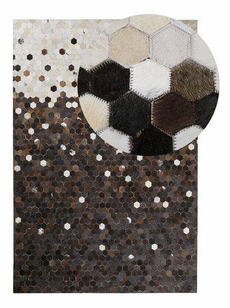 Perfektní doplněk do rustikálního či industriálního interiéru. Tento kvalitní koberec z hovězí kůže je nejen stylový, ale také odolný. Je ručně vyroben z béžových a hnědých šestiúhelníků, které vytvářejí jedinečnou mozaiku. Velice pěkně vynikne na dřevěné nebo kamenné podlaze a díky vlasům na povrchu je mimořádně příjemný na dotek.