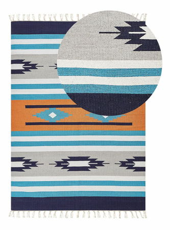 Díky tomuto obdélníkovému kelímovému koberci vnesete do jakéhokoli prostoru výrazné barvy a poutavý design. Je vyroben z bavlny, má geometrický vzor a třásně a krásně zapadne do různých stylů interiéru. Koberec je oboustranný, nevyžaduje časově náročnou údržbu a lze jej prát v pračce.