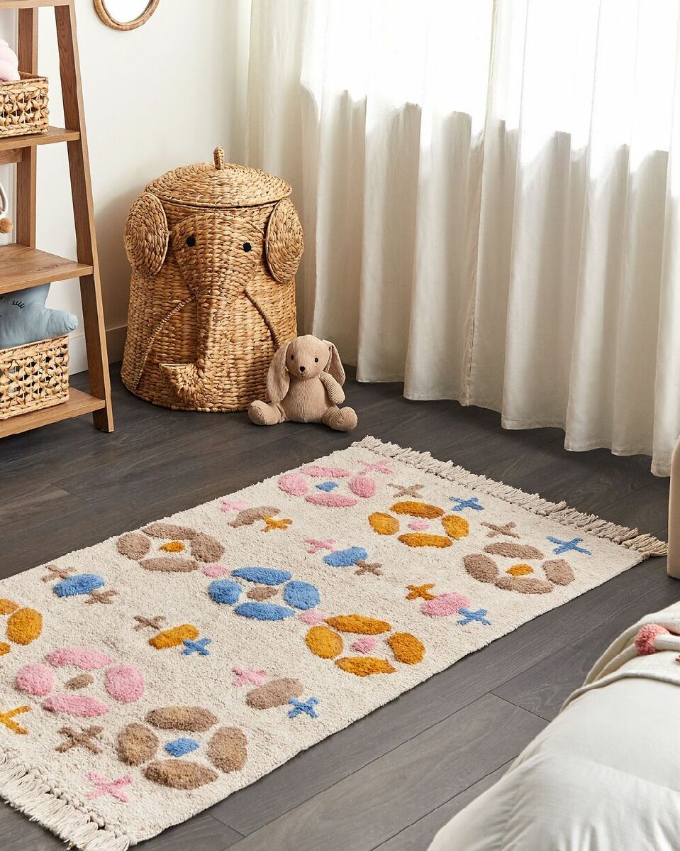 Vytvořte z pokoje vašeho dítěte útulné místo ke spaní a hraní si s tímto stylovým kobercem. Je ozdoben barevným geometrickým vzorem, který vnese do dětského pokoje hravost a veselou náladu. Koberec je vyroben z bavlny, díky které je měkký a odolný, takže vám bude sloužit léta.