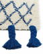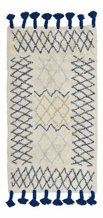 Oživte vzhled svého interiéru stylovými textiliemi a doplňky. Tento pokojový koberec s příjemnou měkkou texturou zútulní jakoukoli místnost. Jednoduchý design béžového podkladu a geometrického vzoru zvýrazňují ozdobné třásně v sytém odstínu modré. Takový ručně všívaný koberec vám bude dělat radost dlouhá léta.