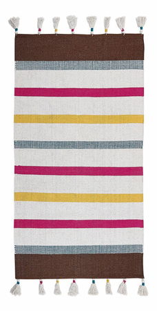 Tento barevný koberec v okamžiku rozzáří celý interiér a stane se zajímavým středem pozornosti. Díky barevným pruhům a ozdobným střapcům je vhodný do interiérů zařízených v různých stylech a hodí se i do dětského pokoje. Je ručně tkaný z kvalitní bavlny.