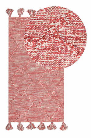 Koberec s geometrickým vzorem a ozdobnými třásněmi vytváří klasický design inspirovaný boho stylem. Kombinace červené a bílé barvy jistě zaujme každého, kdo preferuje doplňky v zářivých barvách. Umístěte jej vedle postele nebo před pohovku a užívejte si příjemný pocit pod nohama.
