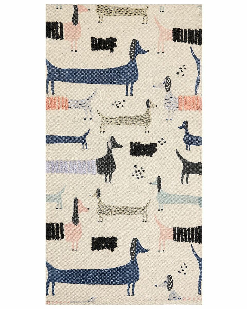 Proměňte vzhled dětského pokoje pomocí moderního koberce a dodejte jí útulný a hravý nádech. Tento ručně tkaný koberec vyrobený z měkké a odolné bavlny nabízí pohodlný a bezpečný povrch pro hraní. Jeho okouzlující potisk s pejsky podnítí fantazii vašeho dítěte a tvůrčí hru. Tento krásný doplněk dokonale doplní jakýkoli styl interiéru – od moderního až po tradiční. Díky spodní straně koberec nebude klouzat po podlaze, takže jeho používání je bezpečné.