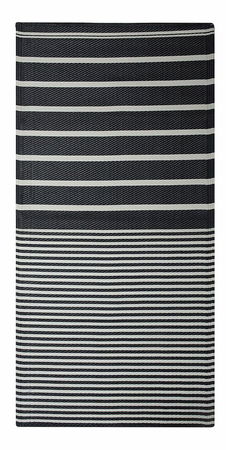 Tento koberec je skvělým dekorativním doplňkem pro jakýkoli vnitřní nebo venkovní obývací prostor. Díky syntetickému materiálu může být použit na terase nebo balkoně a stále si zachová svoji pevnou tkanou strukturu. Má krásný pruhovaný design v černé a bílé barvě, díky kterému vnese do prostoru nádech přímořského stylu.
