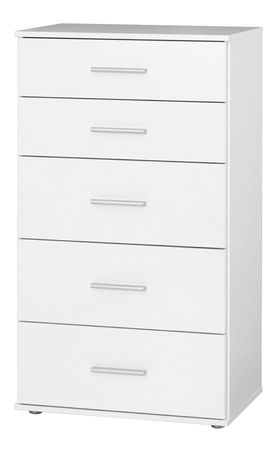 Bílá komoda s pěti zásuvkami, z nichž 3 spodní jsou hlubší a 2 vrchní jsou mělčí.