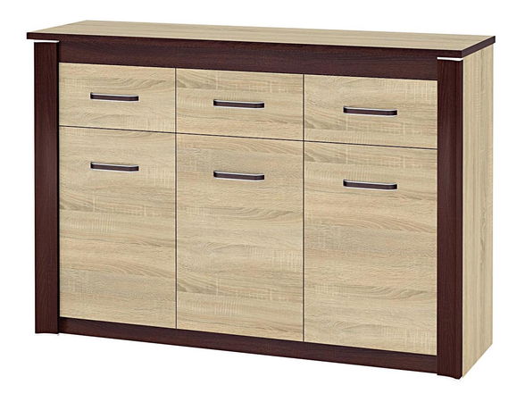 Třídílná komoda se třemi zásuvkami a třemi dvířky.