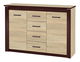 Třídílná komoda se čtyřmi zásuvkami uprostřed a dvířky po stranách.